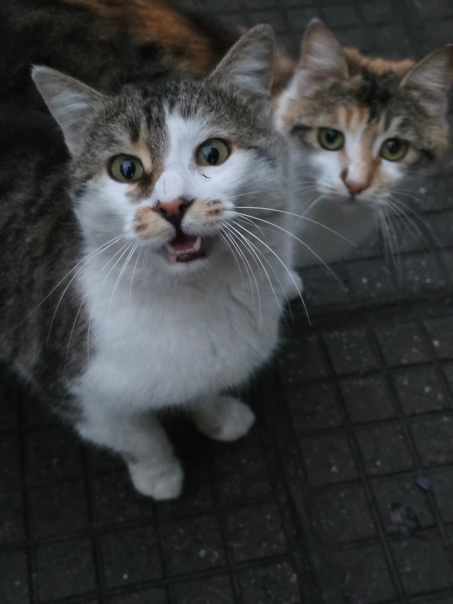 Two cats are captured in an upward-facing shot against a dark, possibly paved surface, likely outdoors. The lower cat, mostly white with grey and brown markings, looks directly at the camera with its…read more