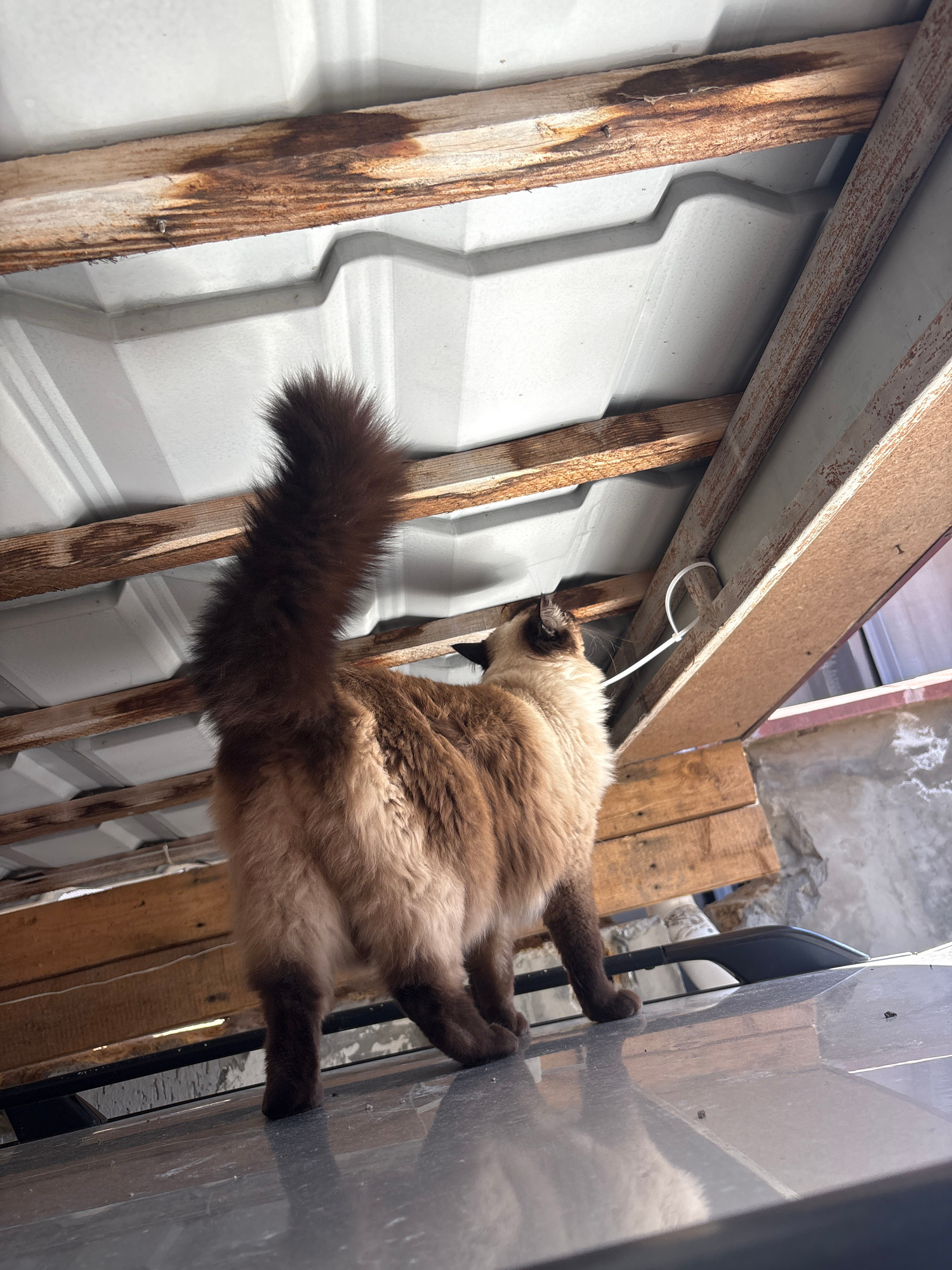 A tan and brown cat is lying on its back, its body oriented vertically in the frame. It is positioned near a gray corrugated metal wall that is supported by wooden planks. Above the cat, there is a wo…read more
