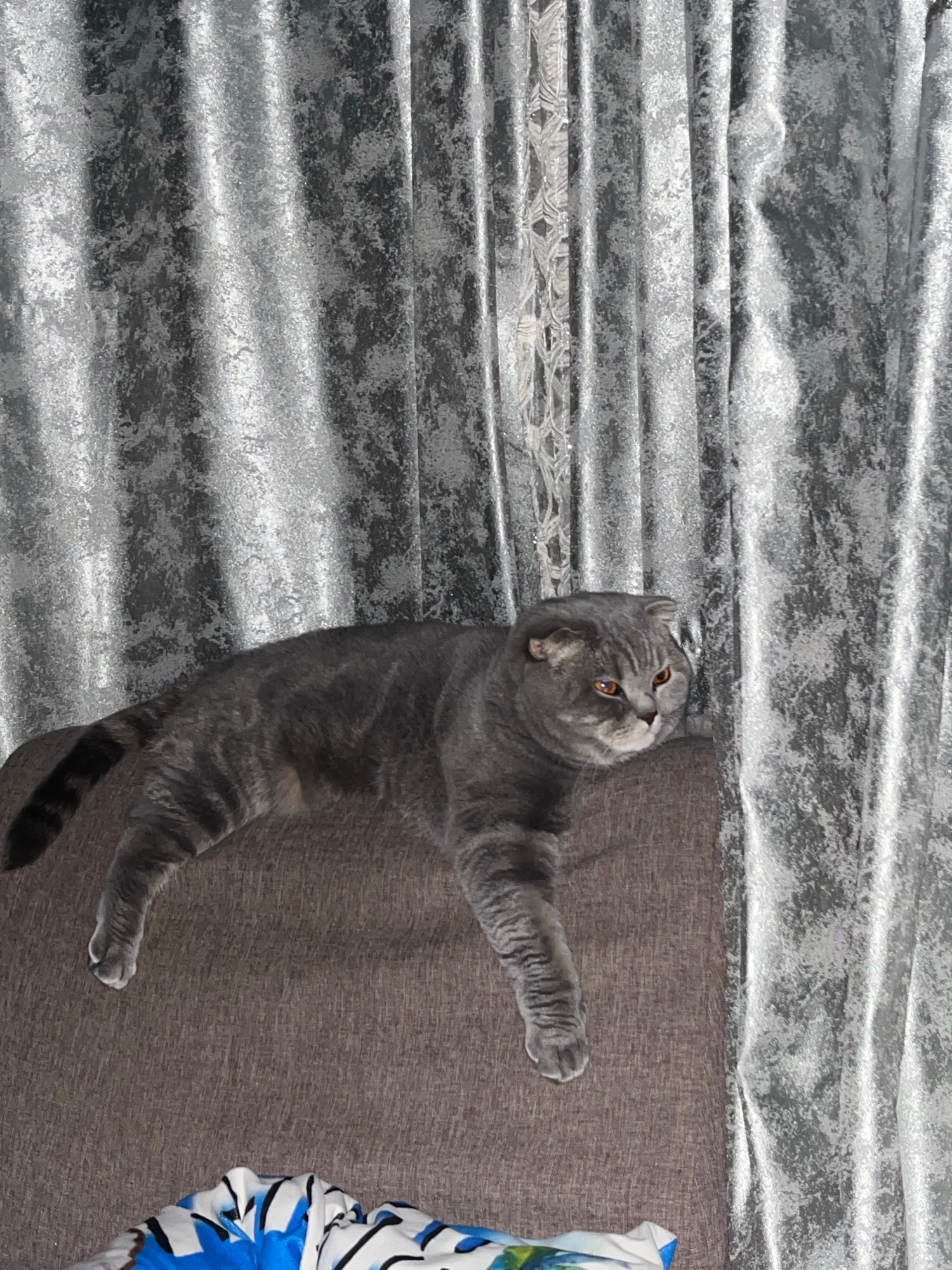 A gray British Shorthair cat lies on a brown couch in an indoor setting. The cat's head is tilted upwards and its body is angled diagonally across the couch. Its right paw is extended. A silver and gr…read more