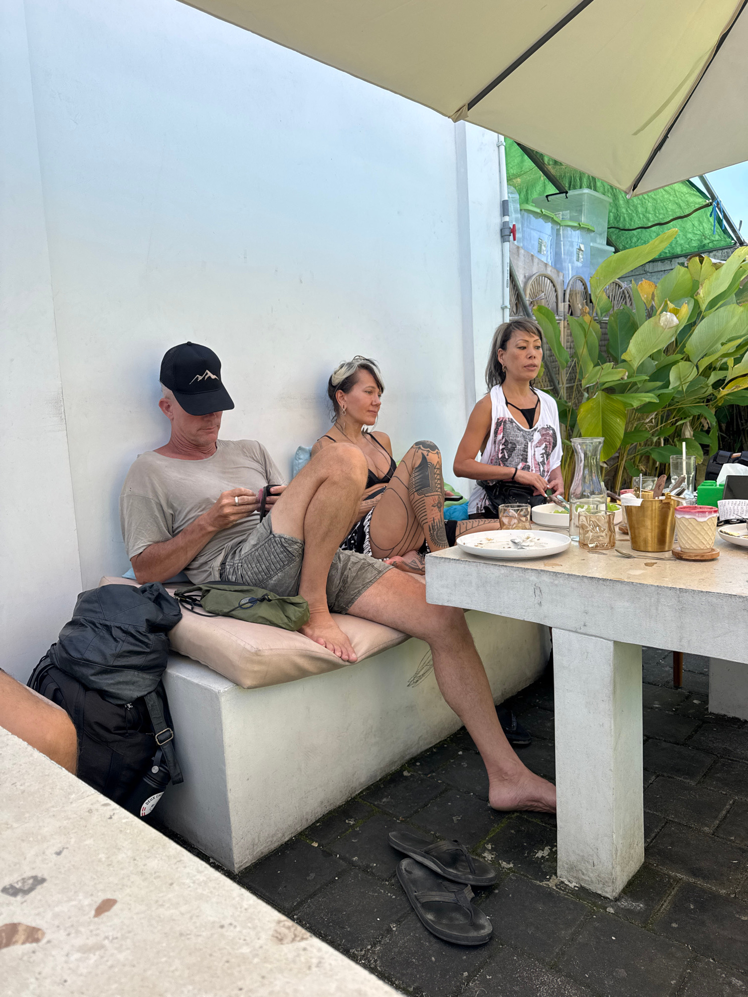 The image shows three individuals seated at an outdoor table in what appears to be a restaurant or cafe in Kuta Selatan, Indonesia. One woman is seated directly at the table, dressed in a white top wi…read more