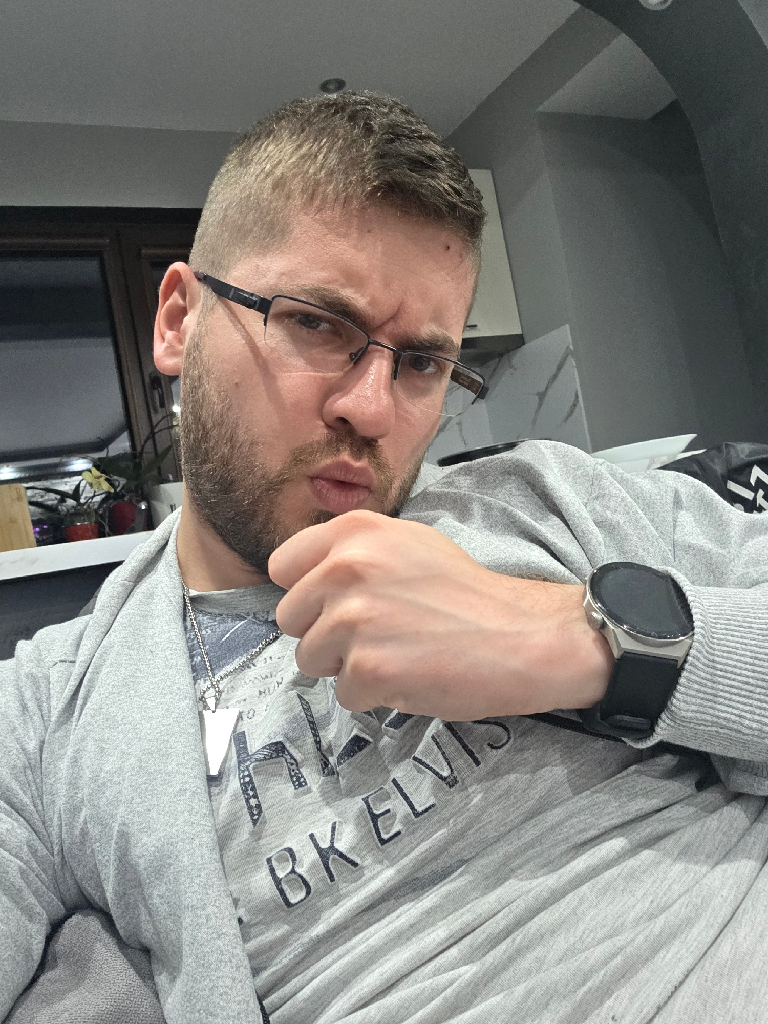 An indoor, close-up shot captures a man in Yagodovo, Bulgaria, looking directly at the camera with a neutral and somewhat pensive expression. The man has short, light brown hair and a trimmed beard. H…read more