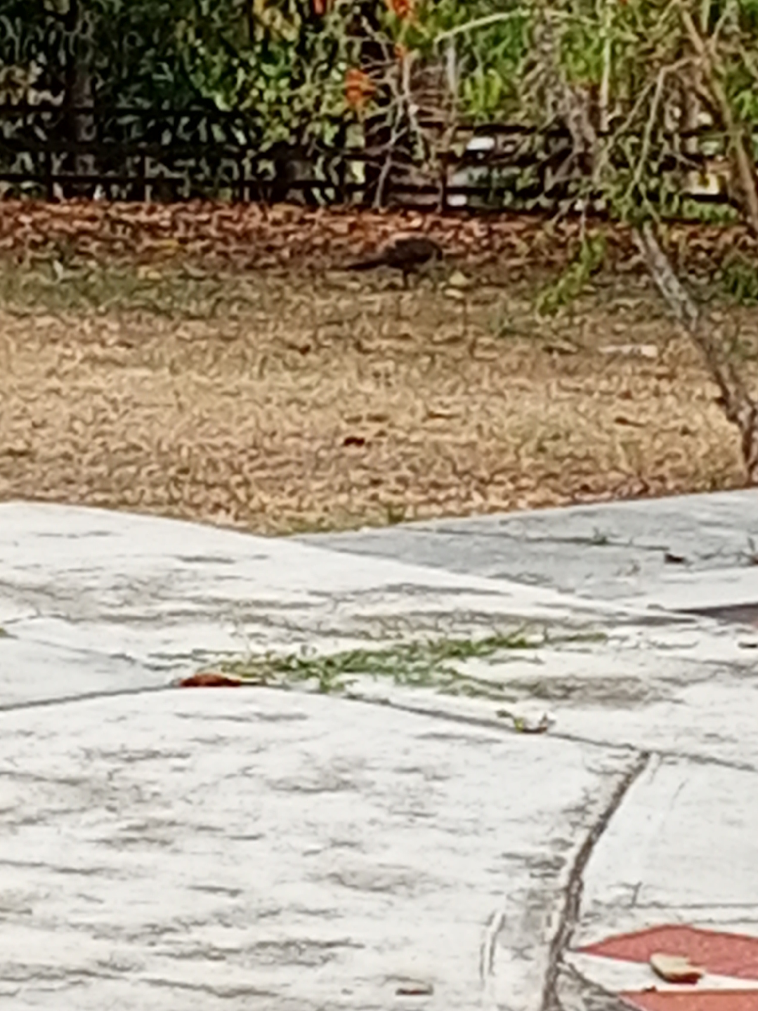 The image depicts a scene with a bird standing in a grassy area. Behind the bird, there is a dense foliage backdrop. In the foreground is a concrete surface, possibly a patio or walkway, with some deb…read more