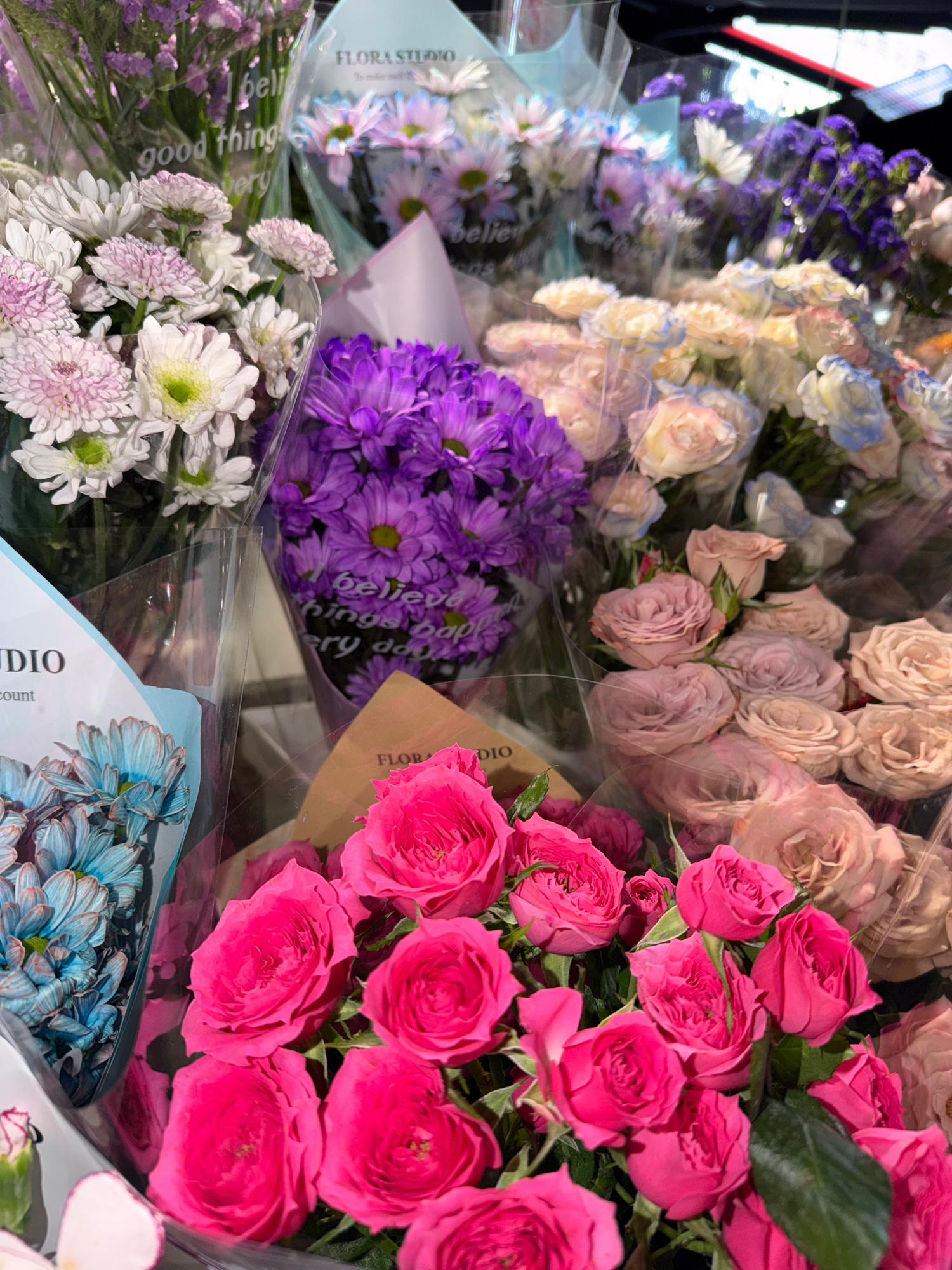 The image displays a vibrant collection of several bouquets of flowers, tightly packed together, likely in a flower shop or market in Chongqing High-tech Zone, China. The flowers are individually wrap…read more