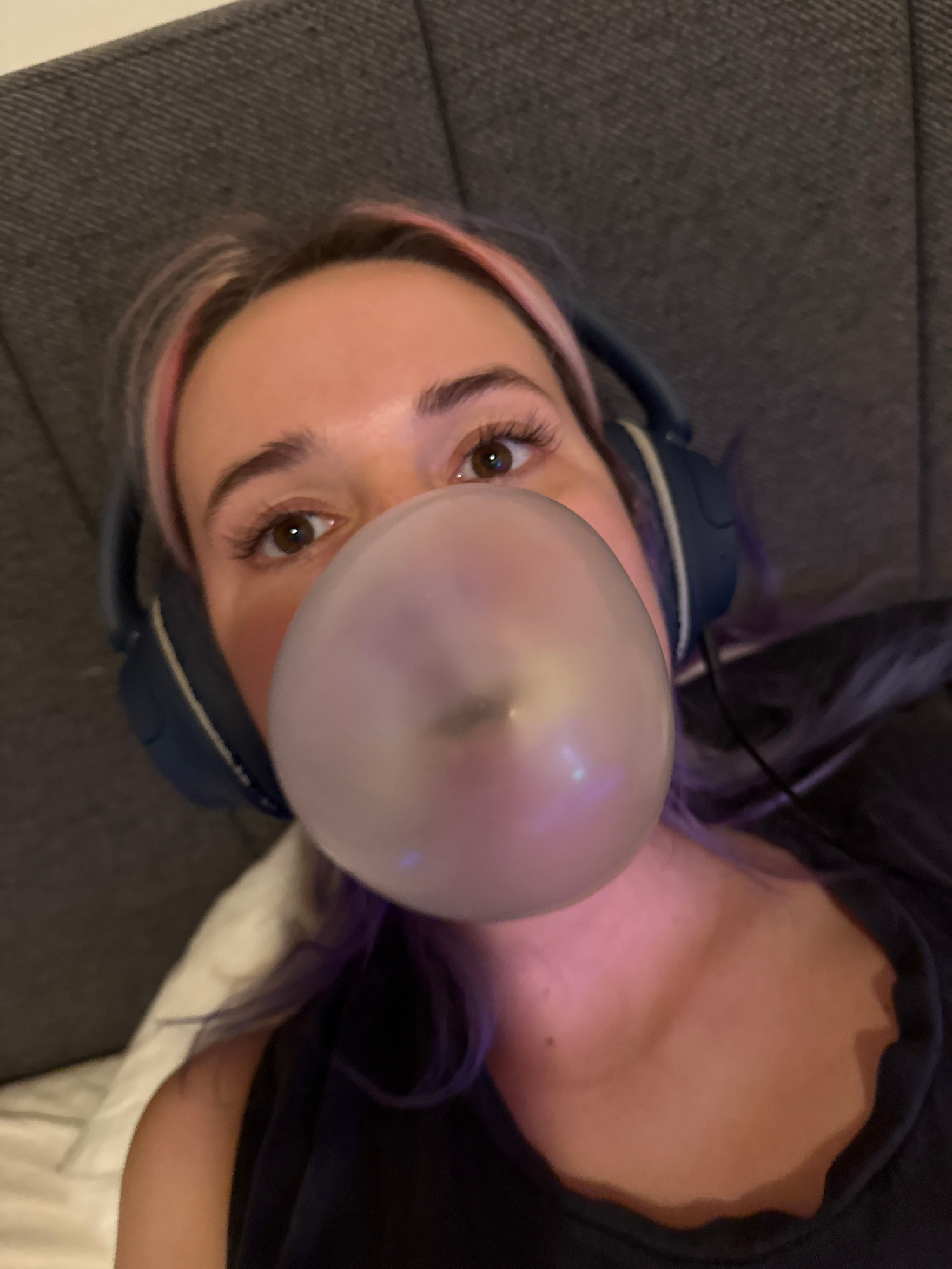 The image shows a close-up, slightly upward-angled view of a young adult female reclining in an indoor setting. She has fair skin, brown eyes, and light brown hair styled with visible pink and purpleβ¦read more