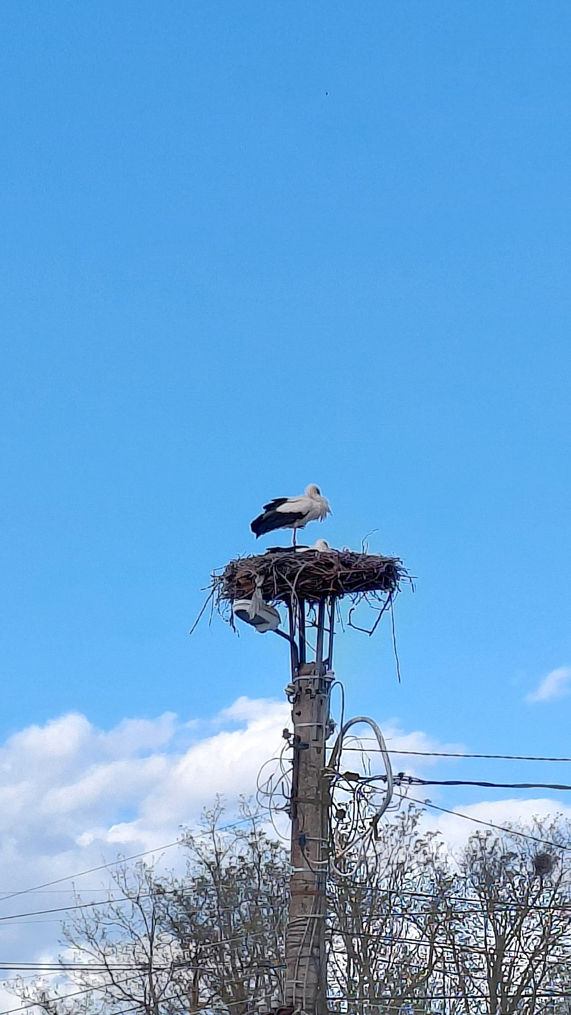 The image depicts a stork's nest atop a utility pole, possibly located in Unknown. Two storks are visible in and around the nest, with one stork perched on the side of the nest and the other standing…read more