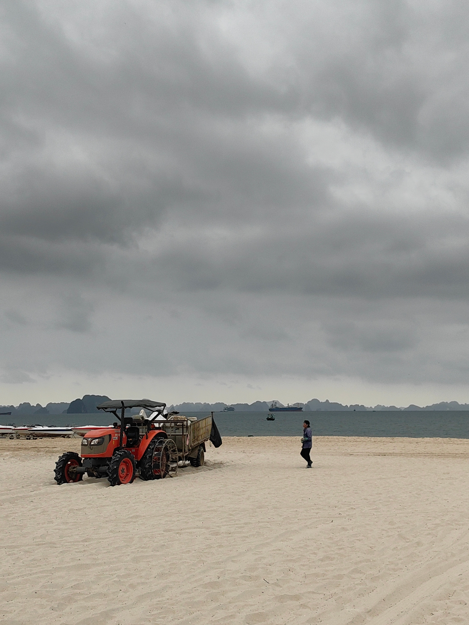 The image shows a beach scene in Bai Chay Ward, Vietnam, under an overcast sky. A compact orange tractor with a trailer is parked on the sand near the left side of the frame. A person is walking on th…read more