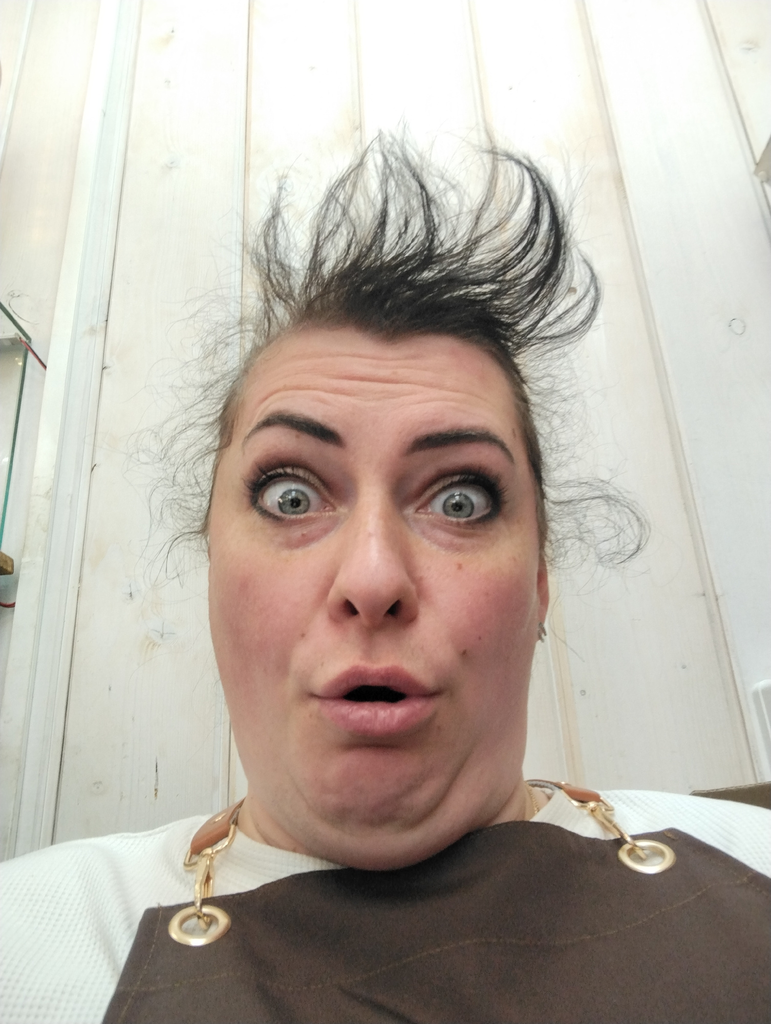 A woman is looking directly at the camera with a surprised expression. Her eyes are wide, and her mouth is open. Her hair is styled upwards in a messy fashion. She is wearing a white top and a brown a…read more