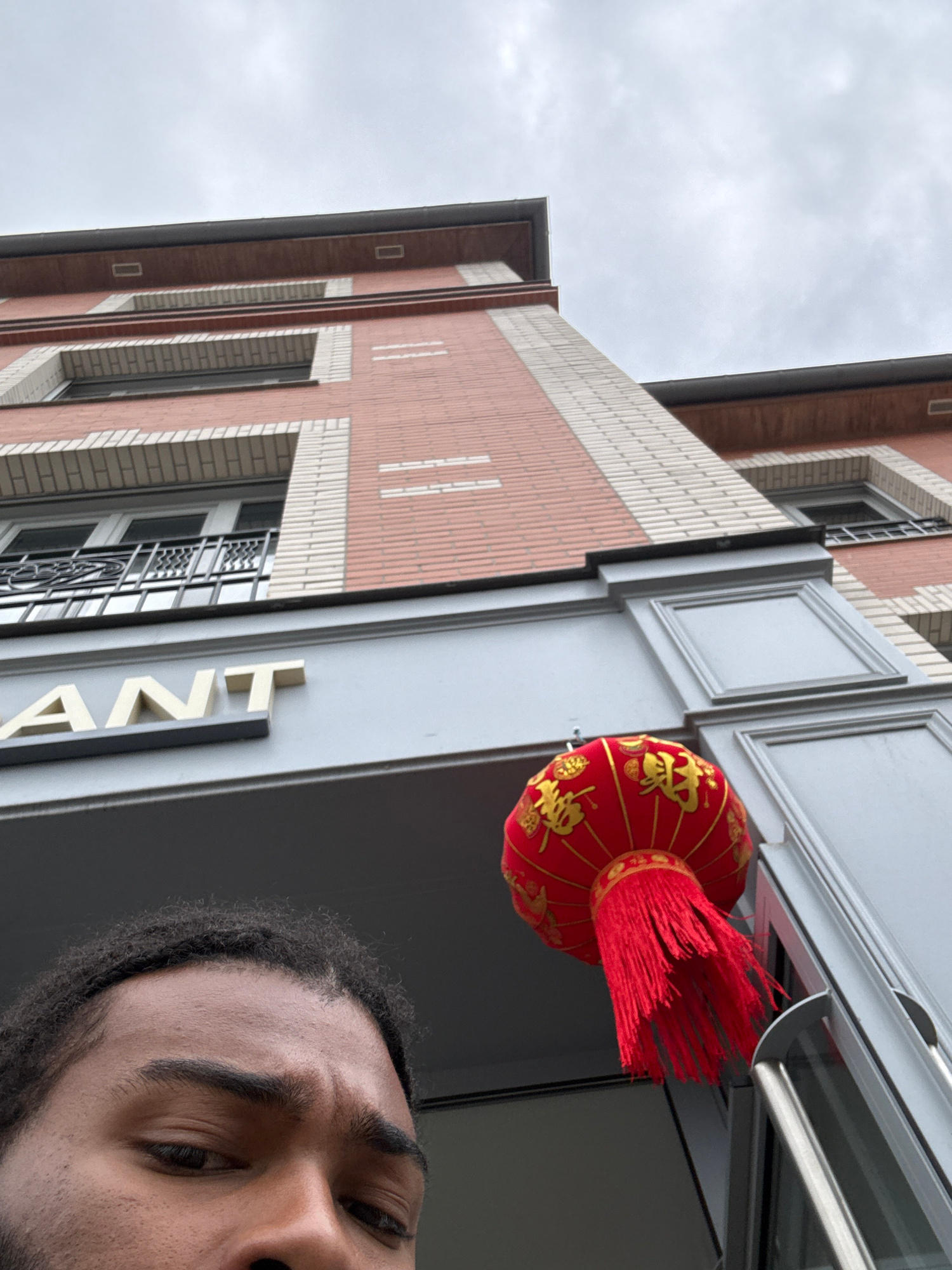 A low-angle outdoor shot in Domont, France shows a partial view of a man's face on the right, with black hair, dark eyes, and tan skin. A red Chinese lantern with gold details and a long red tassel ha…read more