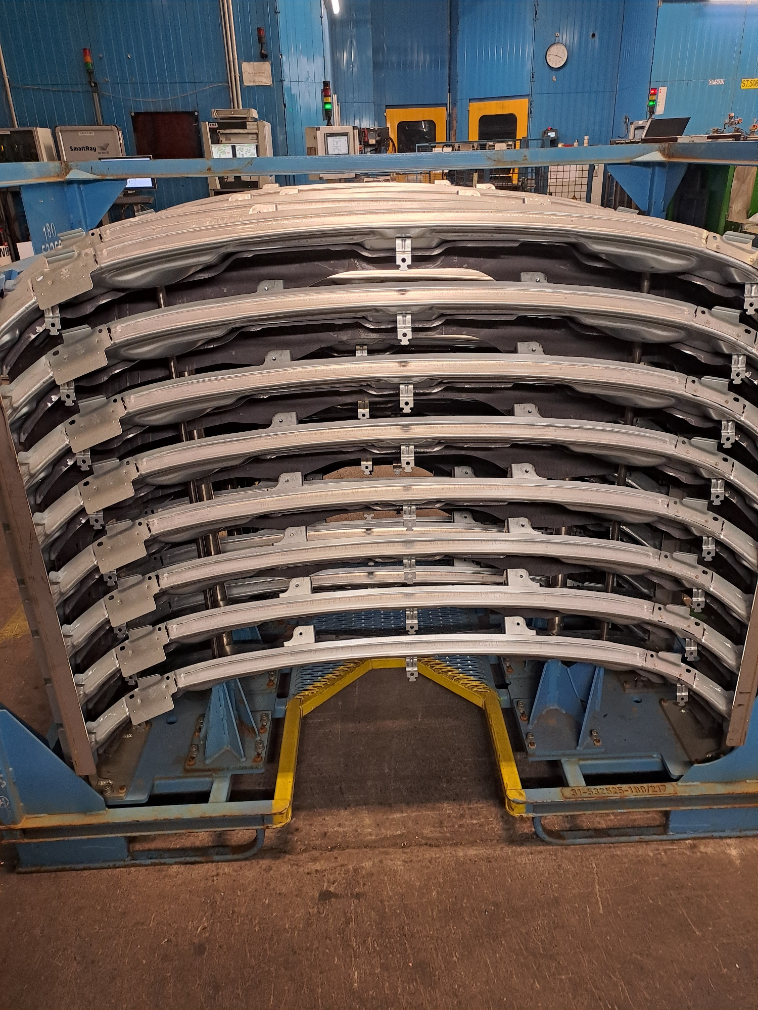 The image shows a metal rack filled with several curved, metal automotive components, possibly door frames or window frames, within an industrial setting. The rack is blue with yellow safety elements,…read more