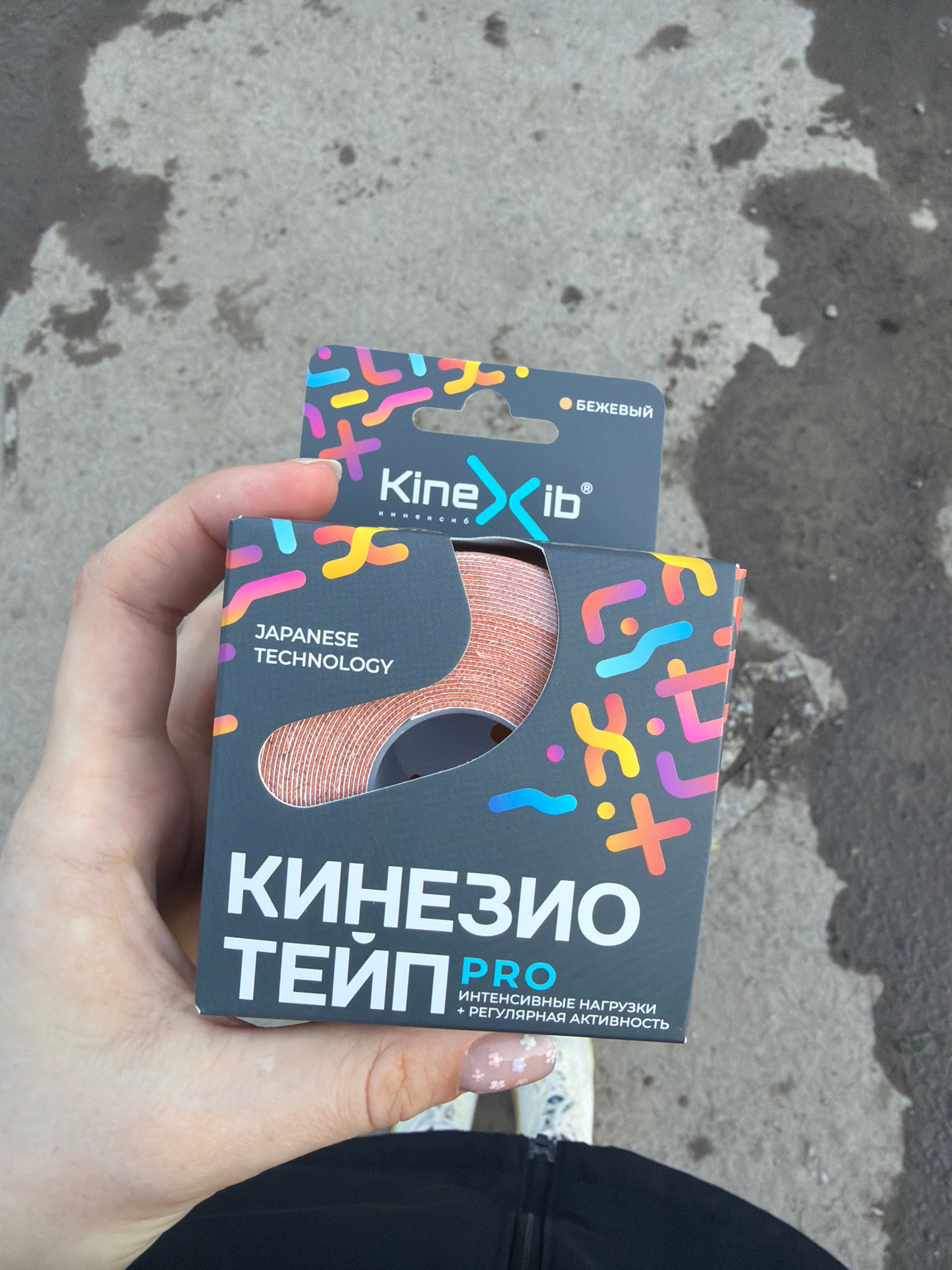 Here is a detailed description of the image: A person is holding two boxes of Kinesio tape in their hand. The tape is beige and the boxes are gray with colorful geometric designs. "Kinexib" is printe…read more