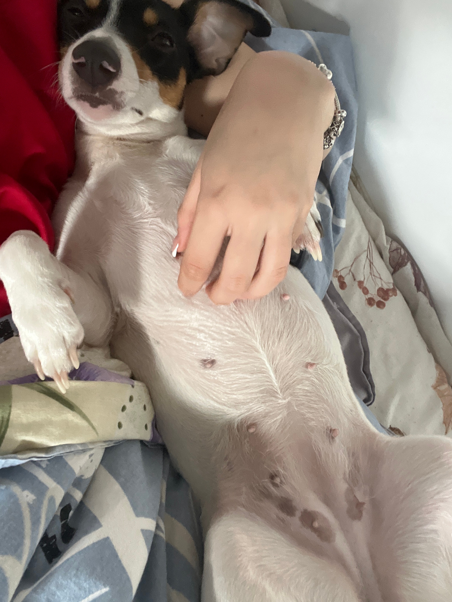 A black, white, and tan dog lies on its back on bedding with multiple patterns. A human hand with a silver bracelet and manicured nails is touching the dog's belly. The dog is facing left, with its ey…read more