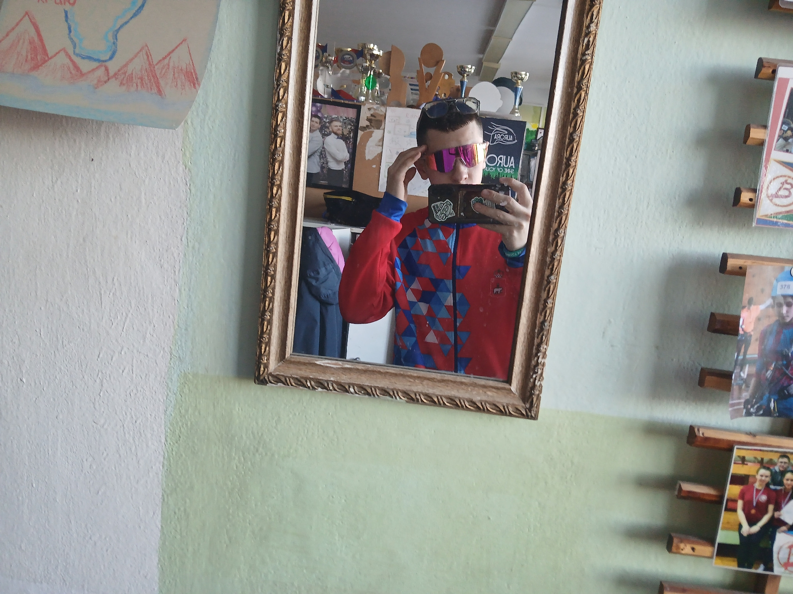 The image shows a selfie of a person in a mirror. The person is wearing a red jacket with blue triangle patterns and sunglasses with pink lenses. They are holding a phone with stickers on it, taking a…read more