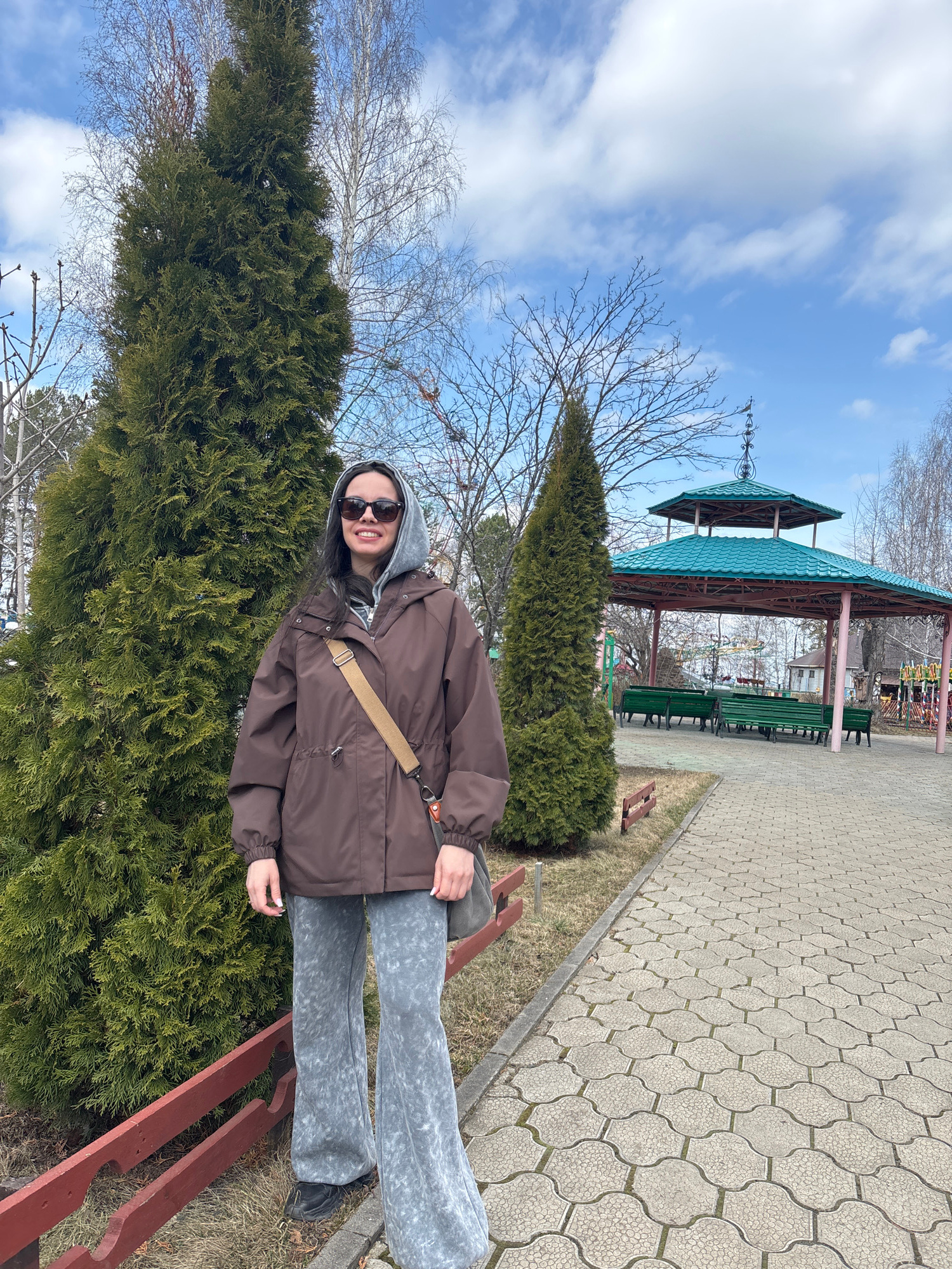 A medium shot photograph shows a woman in a brown jacket and grey sweatpants standing outside in Chaikovsky, Russia. She is wearing sunglasses and a hood. Behind her are evergreen trees and a pergola…read more