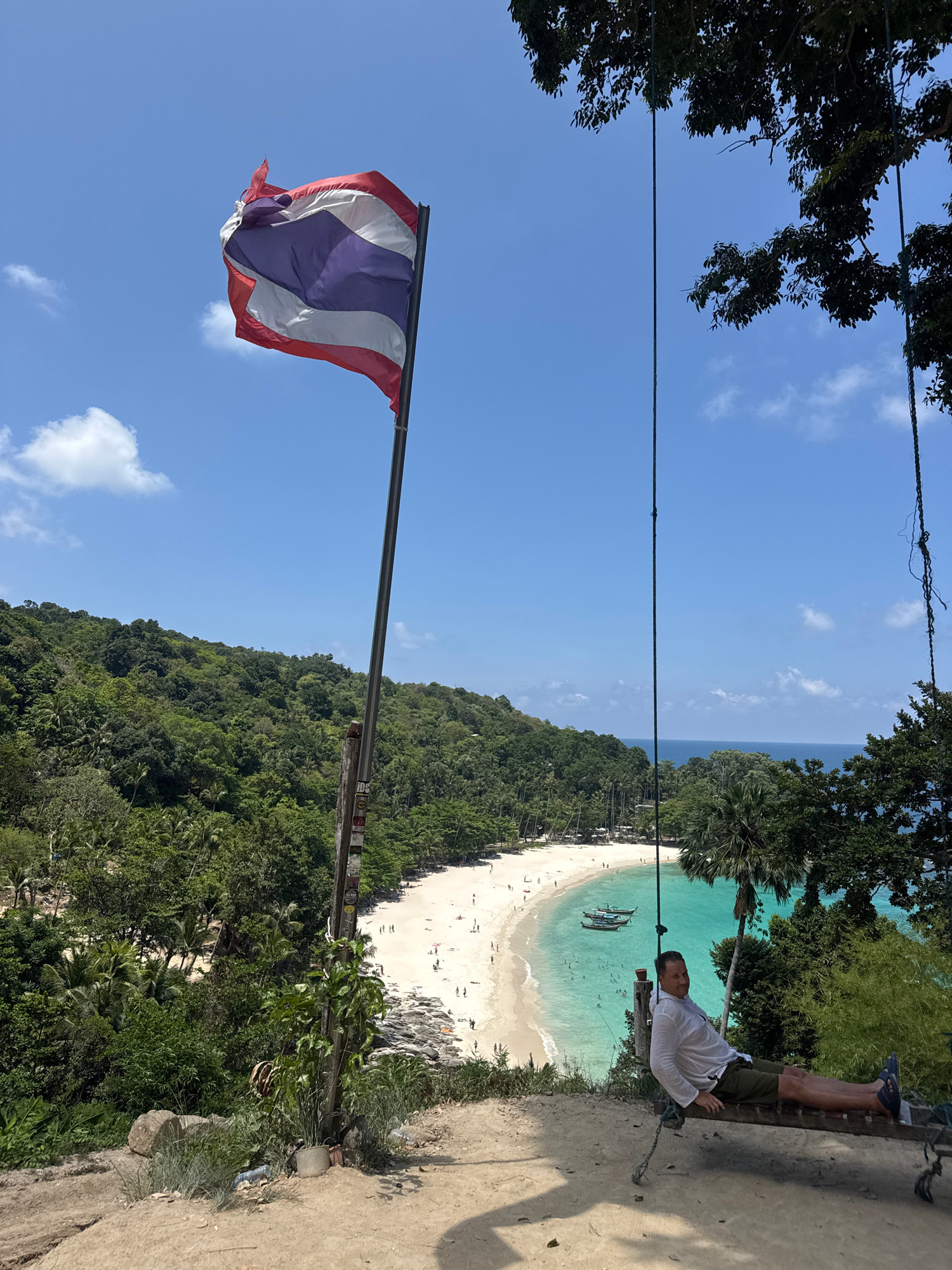 The image presents a high-angle view of a beach scene in Patong, Thailand. The Thai flag is prominently displayed in the lower left corner against a blue sky. A sandy beach curves along the coastline,…read more