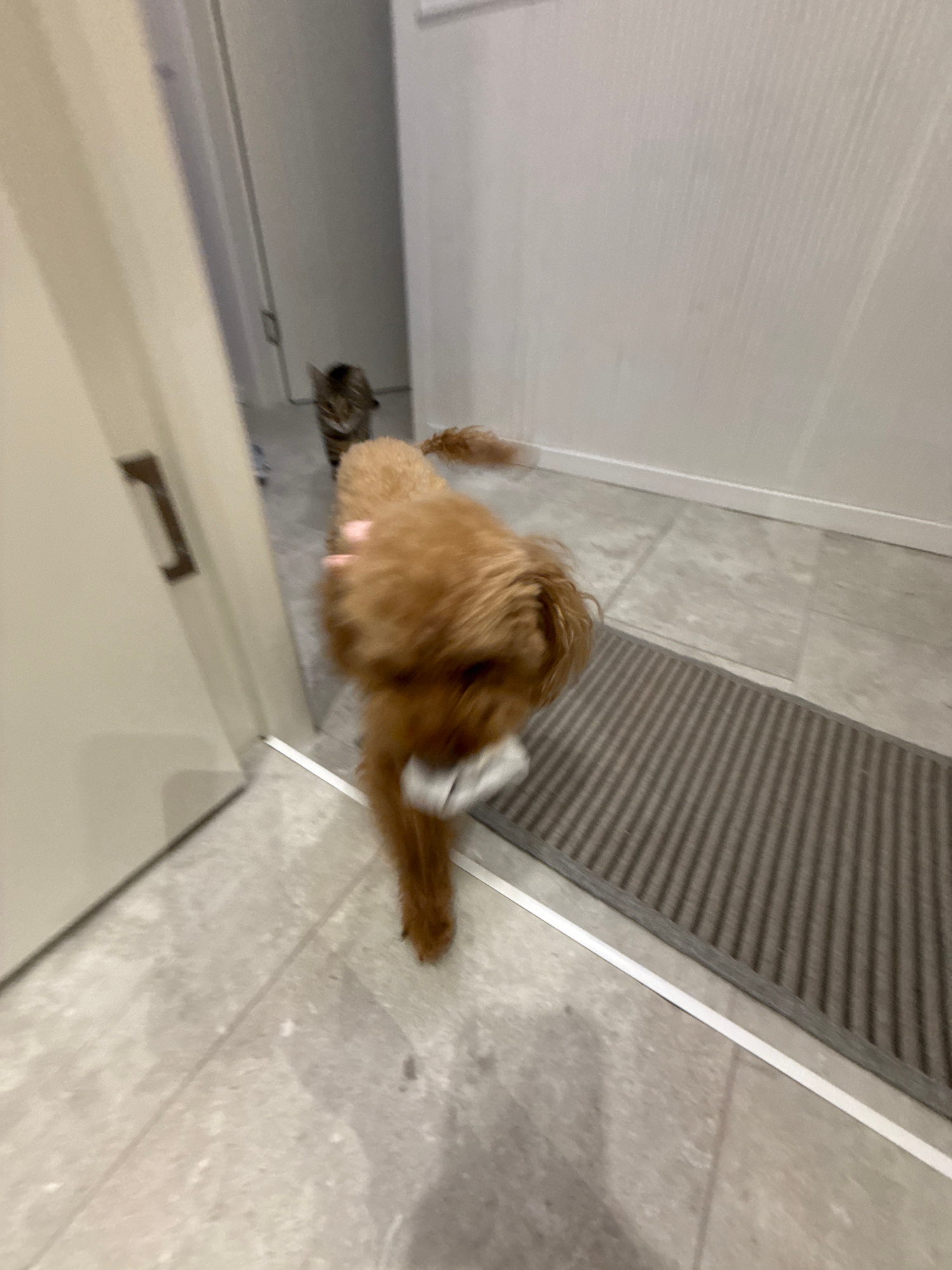 This image, captured in Plovdiv, Bulgaria, presents an indoor scene featuring a small dog and a cat from an overhead, wide-angle perspective. The overall view is slightly distorted due to the lens or…read more