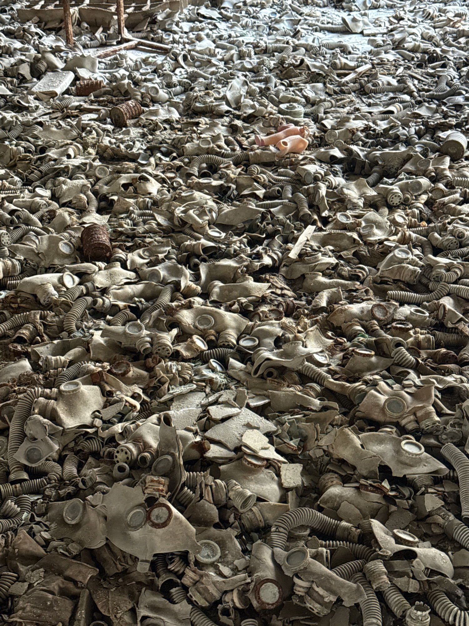 This image shows a wall constructed of discarded gas masks in Prypiat, Ukraine. The masks are mostly gray, with some showing damage or disintegration. Interspersed among the masks are corrugated hoses…read more