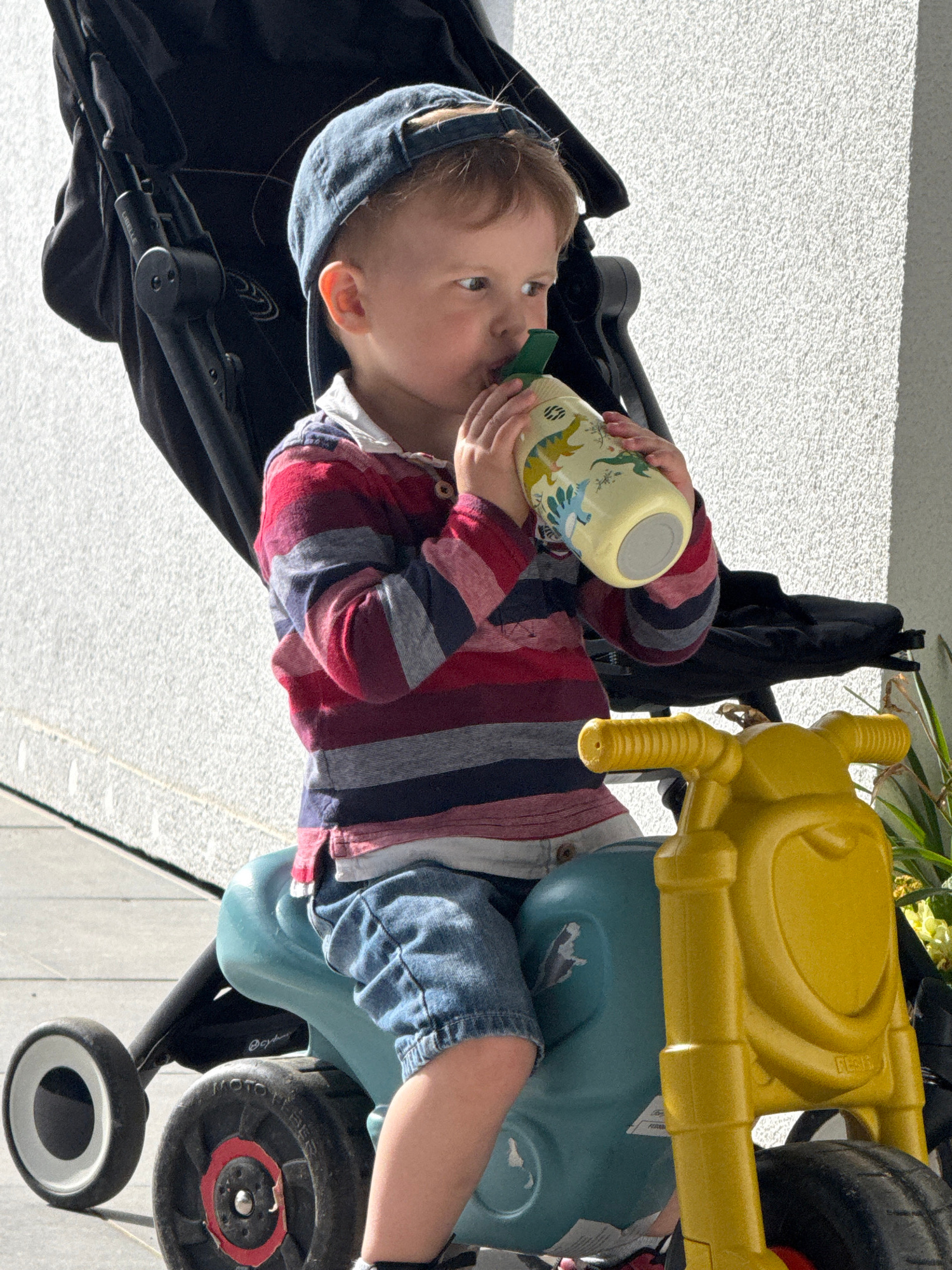 A young child in a blue cap, red, white, and blue striped shirt, and blue shorts is drinking from a light yellow bottle with green and blue designs. The child is sitting in a light blue tricycle withβ¦read more