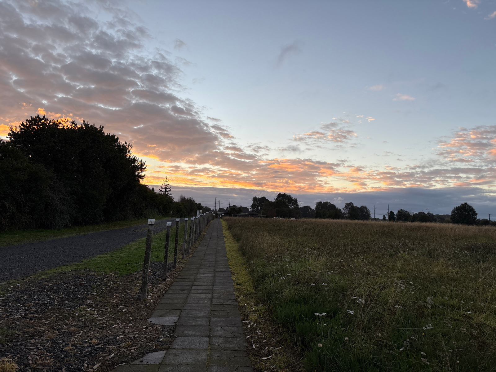 The image shows a path in Purranque, Chile, at dusk or dawn. A paved pathway runs diagonally from the lower center to the vanishing point near the horizon. A gravel path lies parallel to the paved patβ¦read more