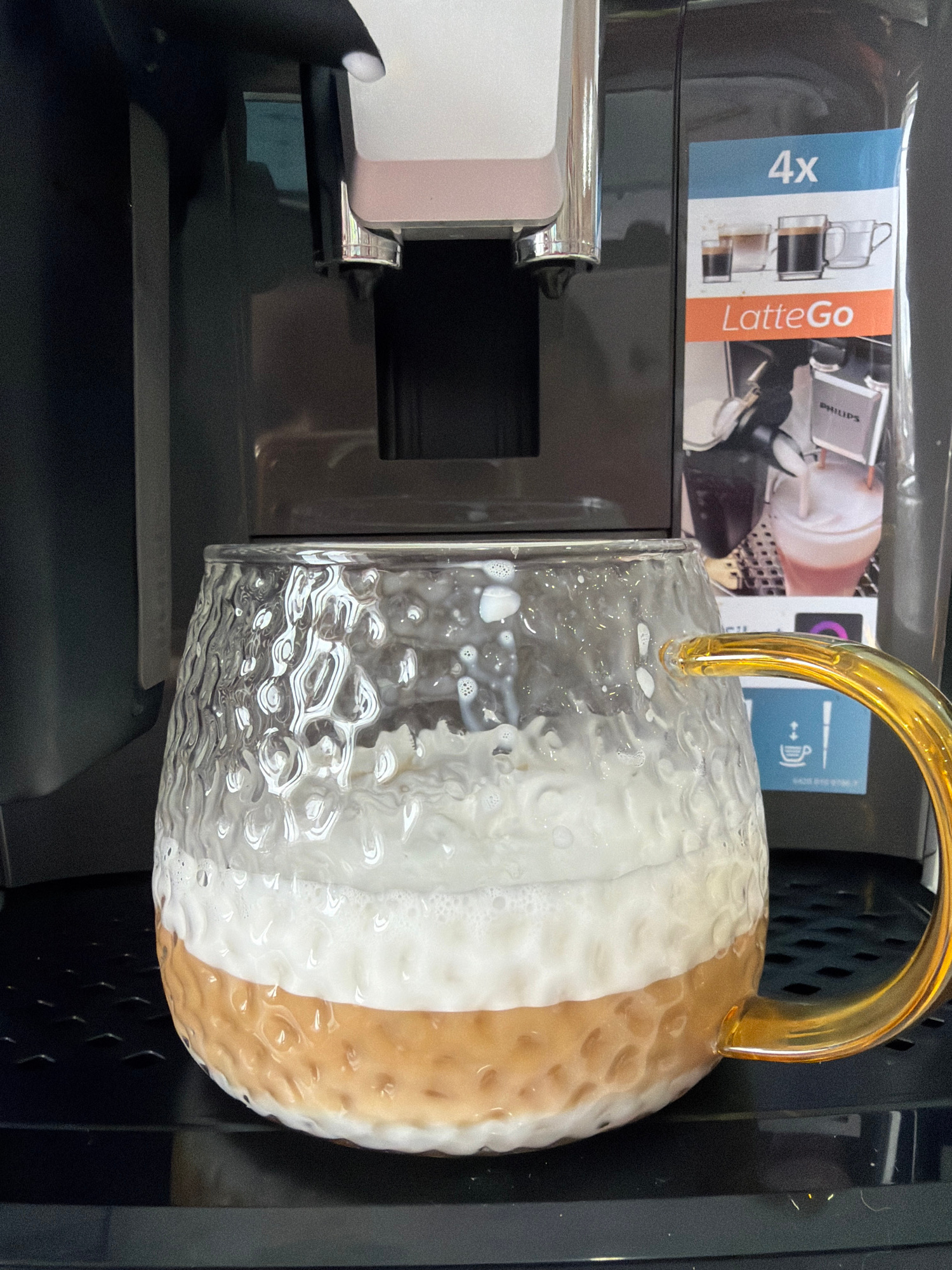 A glass mug with a golden handle and a two-toned drink (white and tan) is placed under the dispenser of a Philips LatteGo coffee machine. The machine is mostly black. There is a LatteGo packaging box…read more