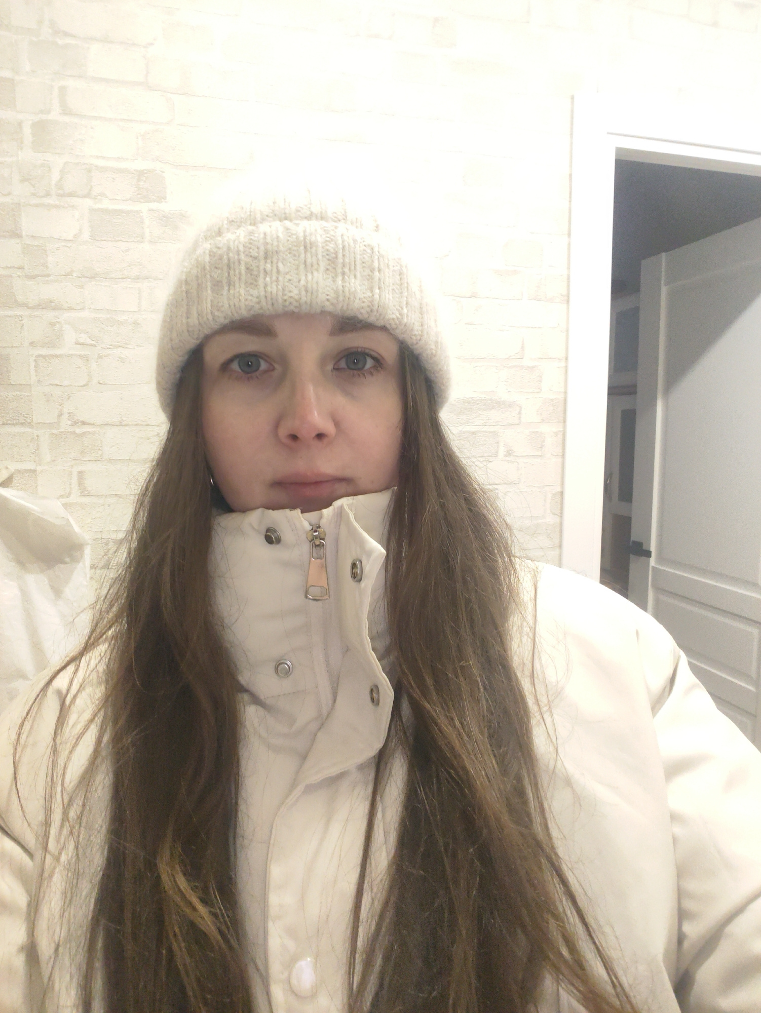 A woman is centered in a medium shot. She is wearing a light-colored knitted hat, a light-colored puffer jacket with a zipper and buttons, and has long brown hair. She faces the camera directly. The b…read more