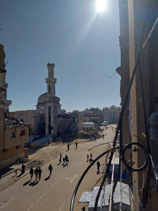 This elevated view depicts a street scene in Khan Yunis, Palestinian Territory, under a clear blue sky with the sun prominently positioned in the upper right. In the immediate foreground on the right,…read more