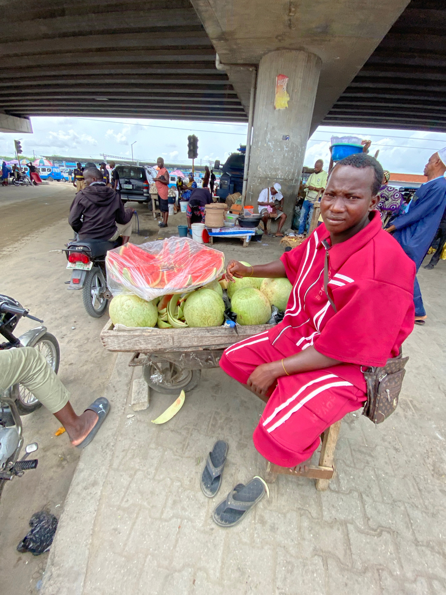 The image shows a street scene, likely a market, in Lekki, Nigeria. A man in a red tracksuit sits on a wooden stool next to a handcart filled with whole watermelons and bags of cut watermelon slices.…read more