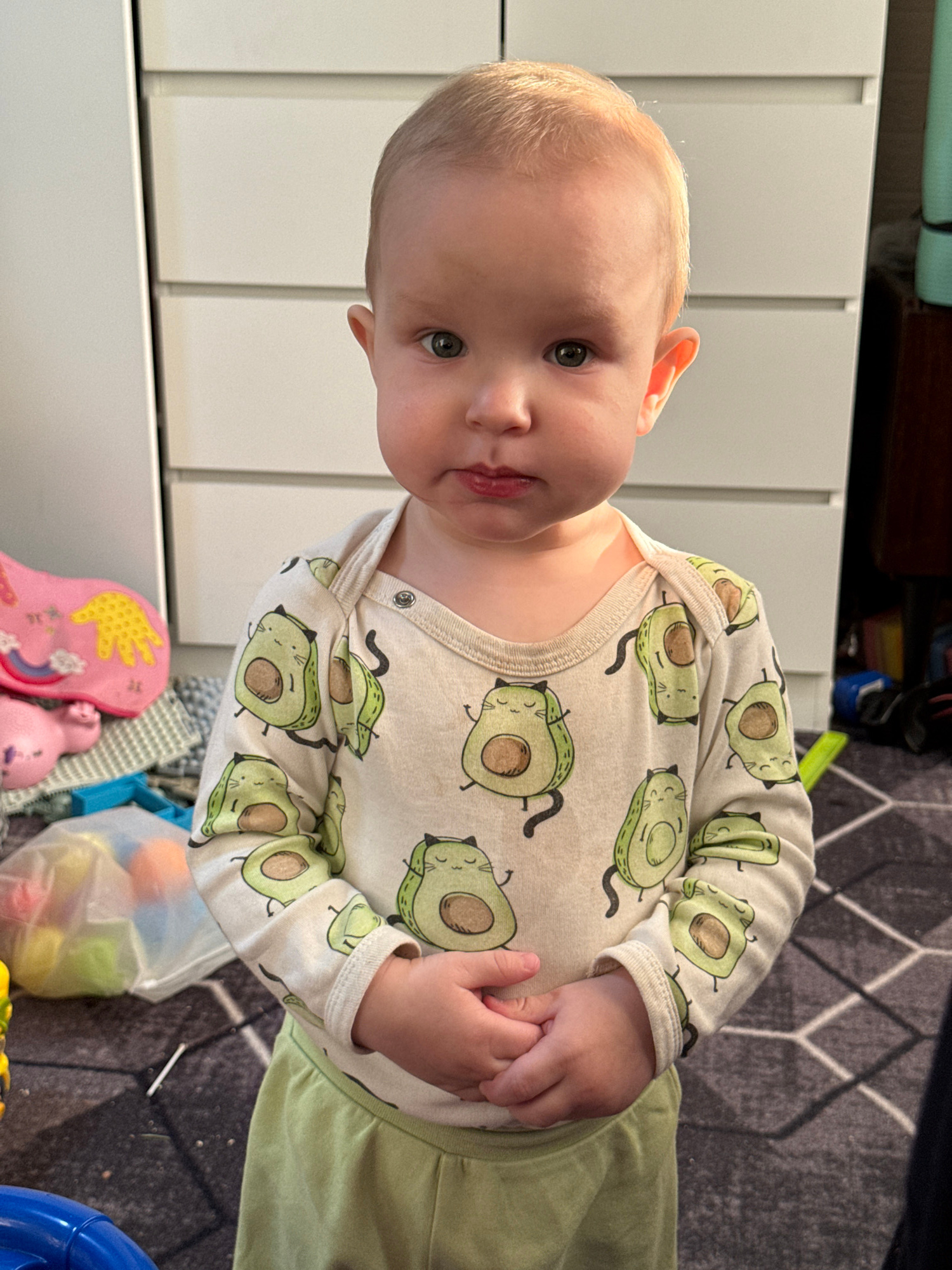 A toddler is the primary subject of the image, wearing a long-sleeved onesie with an avocado print, and light green pants. The child has fair skin, light-colored hair, and is looking at the camera wit…read more