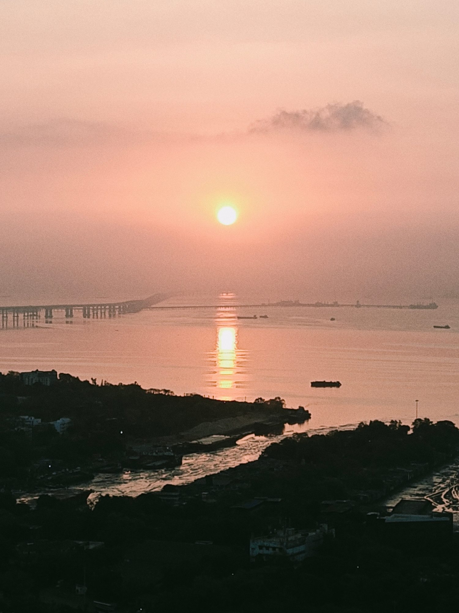 The image captures a sunrise scene in Mumbai, India, featuring the Bandra-Worli Sea Link bridge extending across the Mahim Bay towards the horizon. The sun is positioned centrally in the frame, reflec…read more