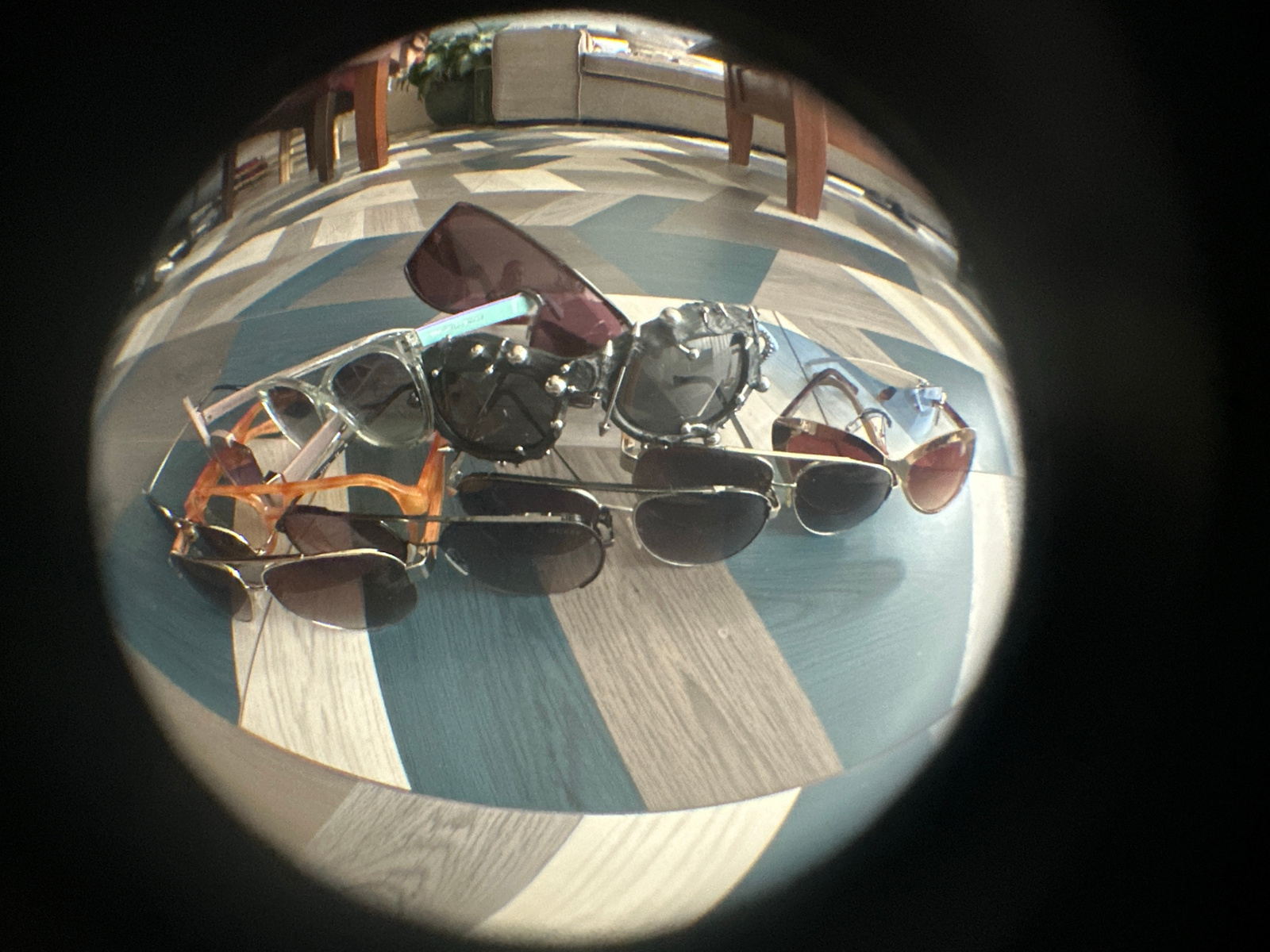 The image, shot through a fisheye lens, shows several pairs of sunglasses arranged on a surface with a blue and grey patterned floor. In the blurred background, there are glimpses of outdoor seating,…read more