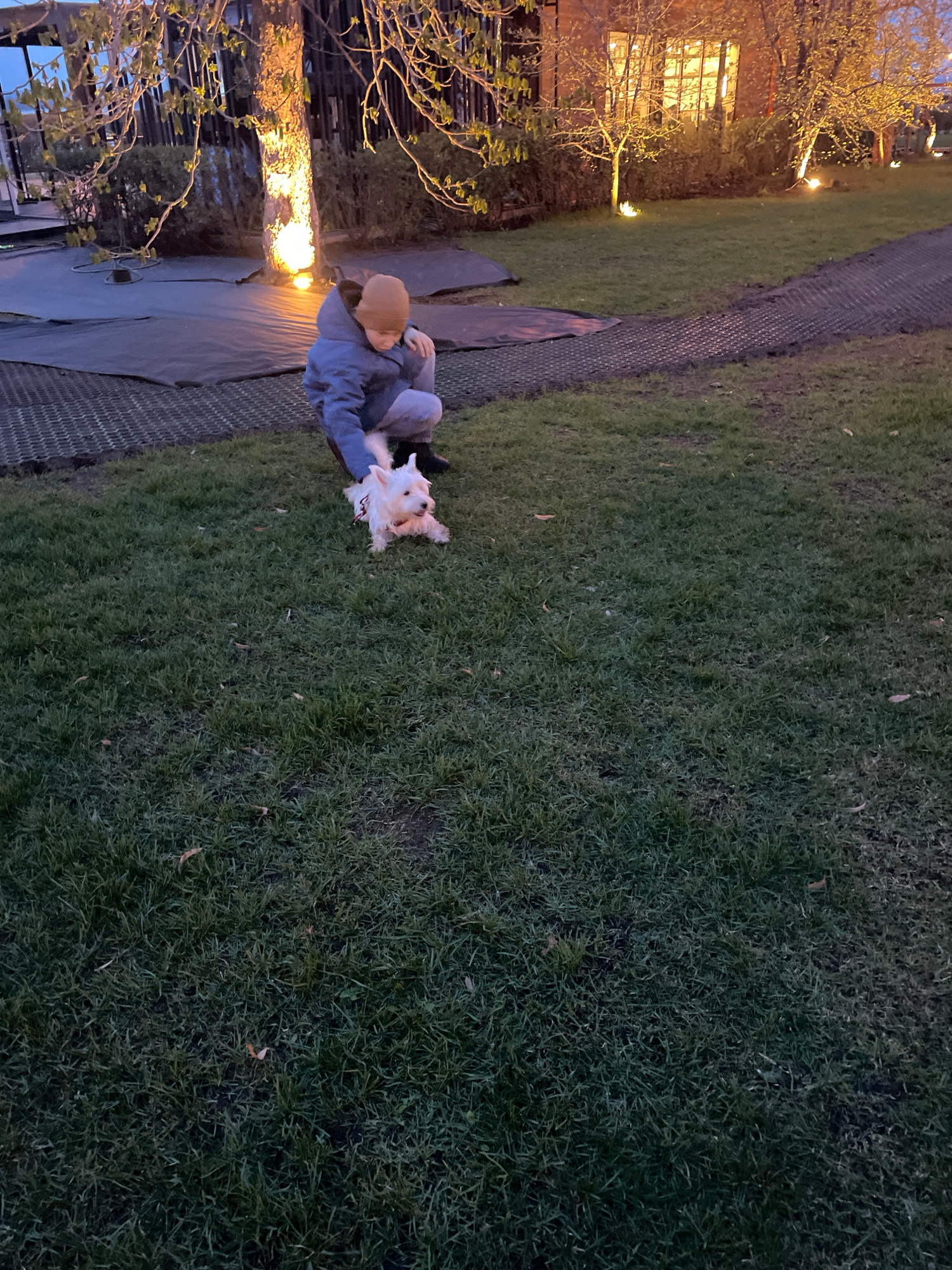 The image depicts an individual sitting on a lawn next to a small white dog. A walkway or path runs along the left side of the lawn, with mesh-like material covering the ground. A tree is near the wal…read more