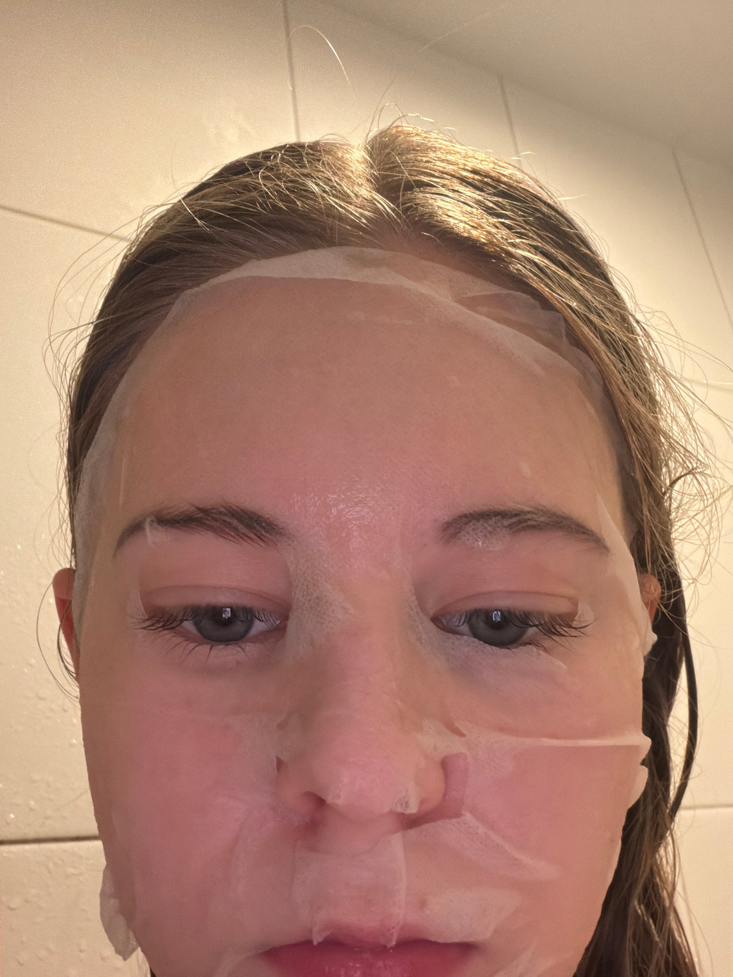 A close-up, angled shot captures a person's face adorned with a white, translucent sheet mask. The individual, appearing to be a young female, is positioned almost horizontally within the frame. Her l…read more
