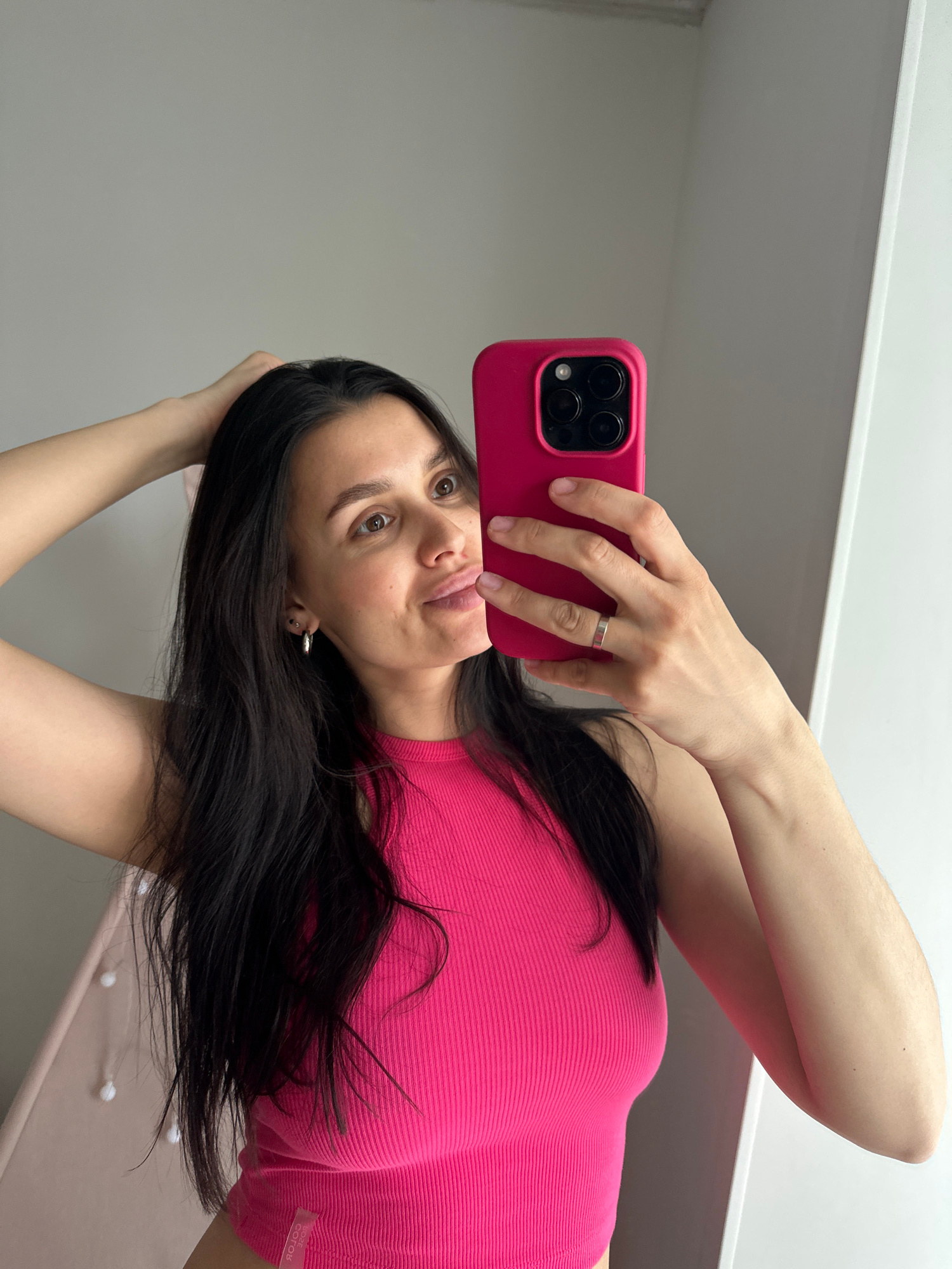 This mirror selfie, captured in Chaikovsky, Russia, features an adult woman with long, dark hair and brown eyes. She is wearing a vibrant hot pink, ribbed top, on which the text "ROSE GOTOK" is visibl…read more