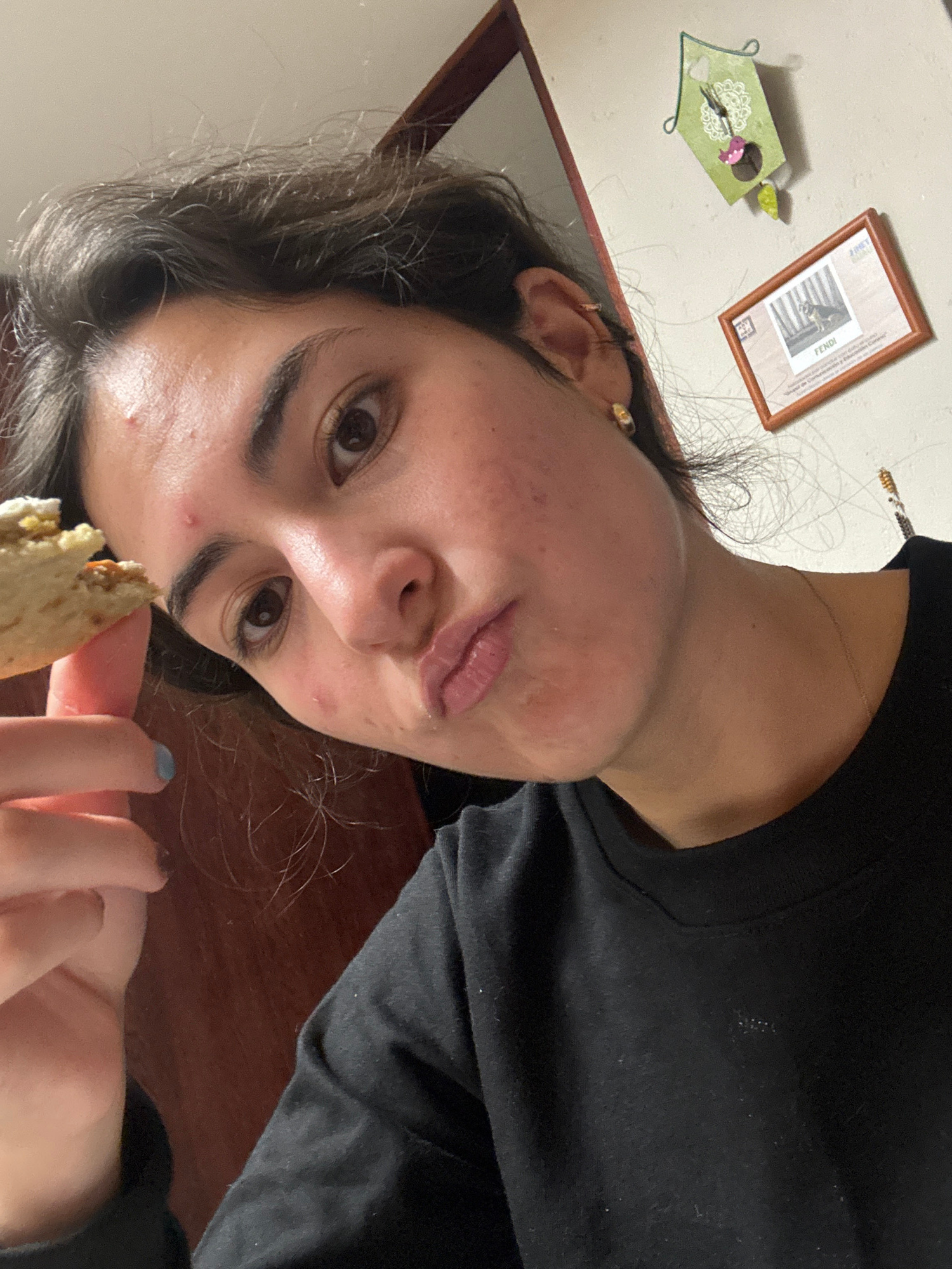 A young woman with dark hair and fair skin is holding a piece of food, possibly bread, near her face. She is wearing a black shirt. Behind her, on a light-colored wall, are a framed picture and a deco…read more