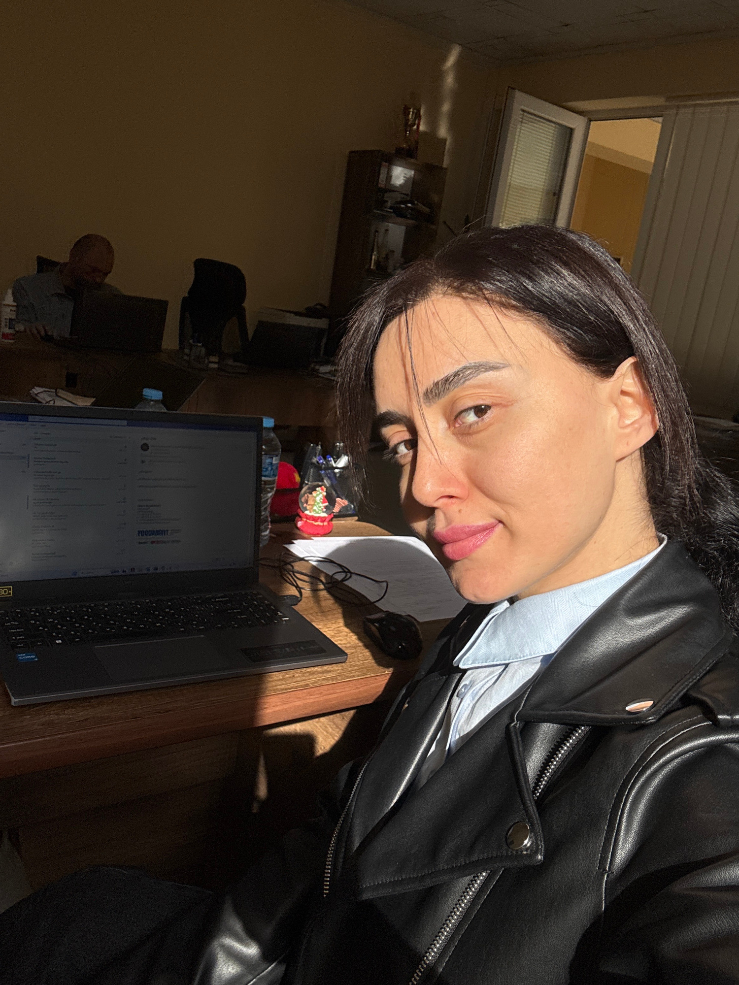 A woman with dark hair and brown eyes poses indoors, wearing a black leather jacket over a light blue collared shirt. She is positioned near a wooden desk with a black laptop displaying a webpage. The…read more