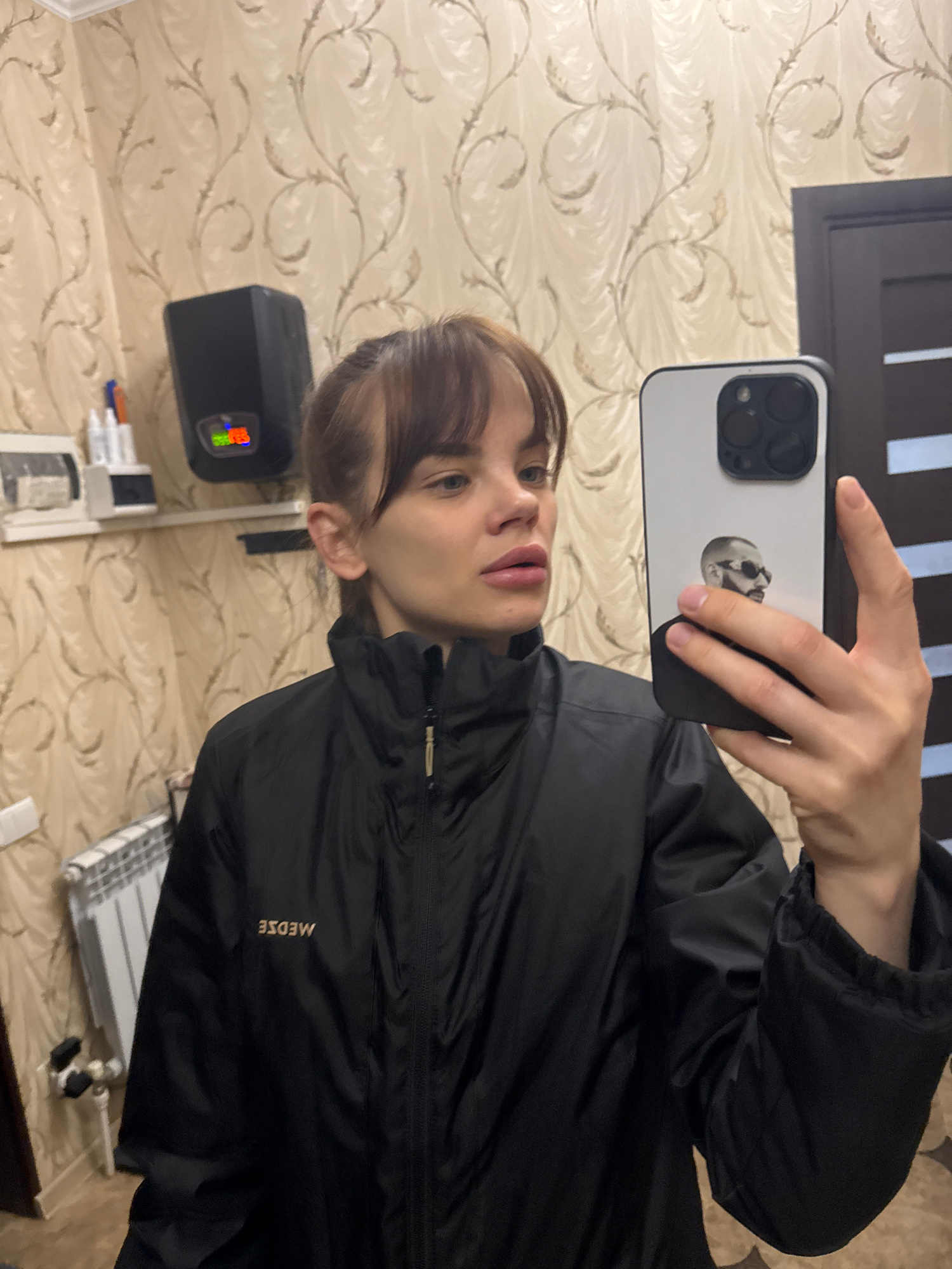 A person is taking a selfie with a white iPhone, featuring a skull design on the back. The individual has light brown hair with bangs and is wearing a black jacket with "MEDSE" lettering on the front. The background shows a wall with a cream-colored floral pattern. To the left of the person is a black electronic device with a digital display, along with white objects stacked below it on a shelf. A partial view of a radiator is visible near the bottom of the image. The location is likely an indoor setting in an unidentified building within Rostov-on-Don, Russia. | Open Wire