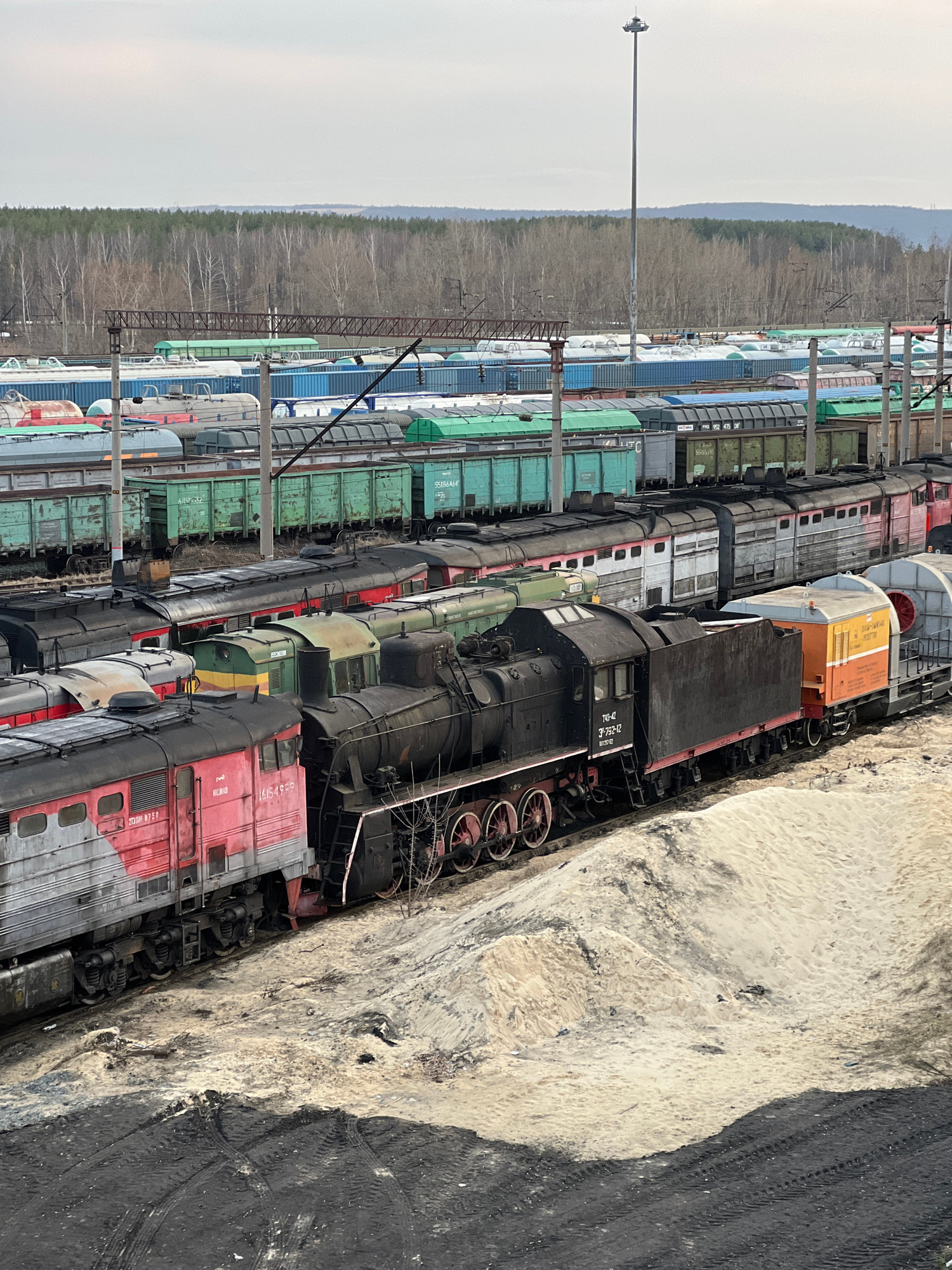 The image shows a collection of trains in Kazan, Russia. Several train cars, including one steam engine, are parked on multiple tracks in what appears to be a train yard. The tracks are next to a pile…read more