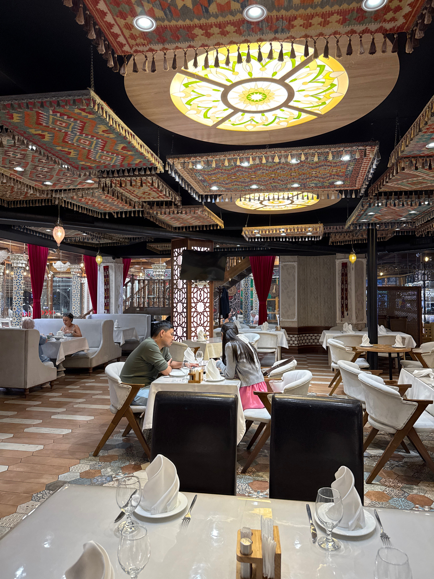 The image shows the interior of a restaurant in Samarkand City, Uzbekistan. The ceiling is decorated with circular light fixtures with stained glass patterns, interspersed with rows of hanging rugs.…read more