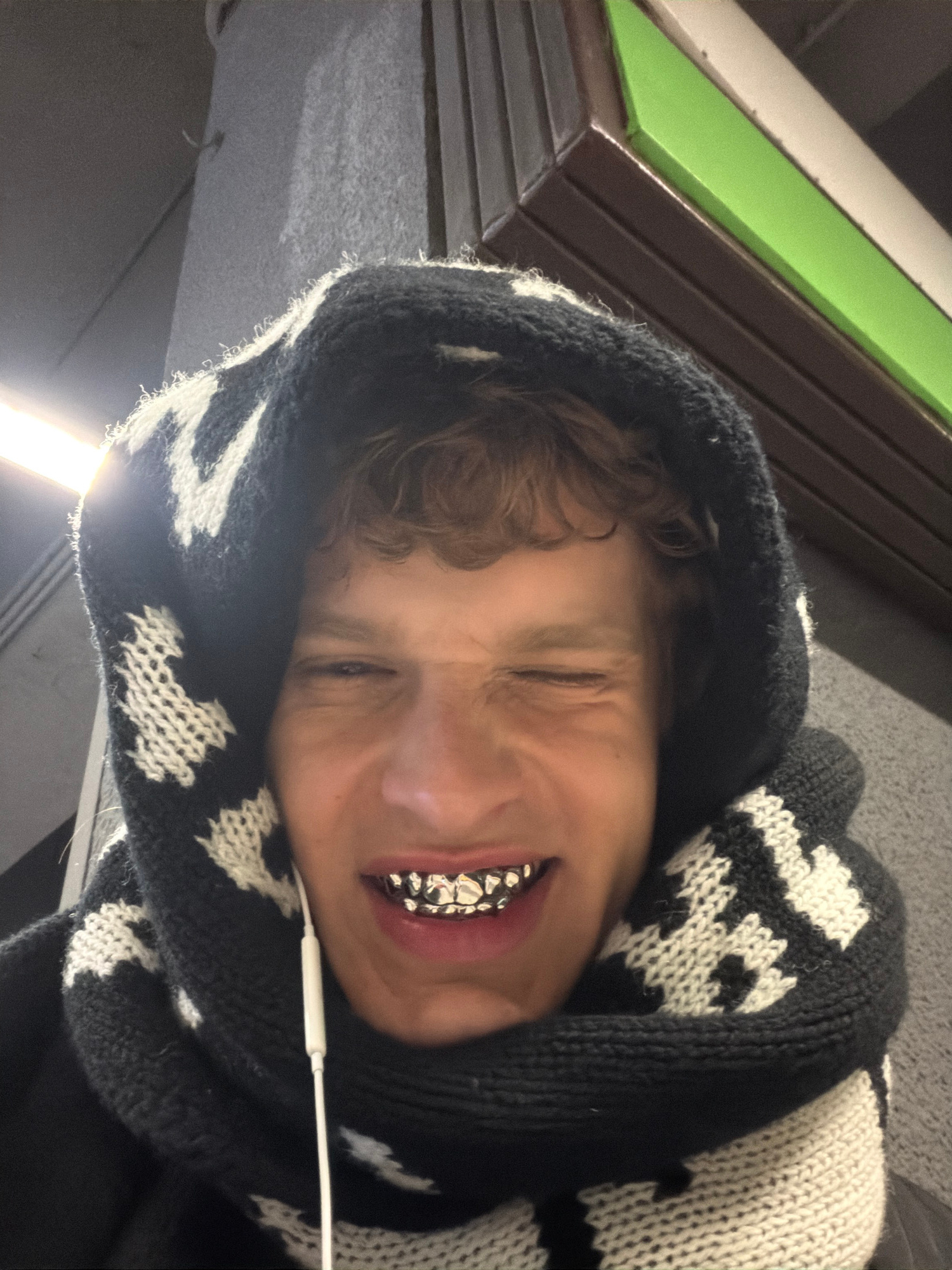 An indoor portrait, rotated 90 degrees clockwise, features a young person with curly brown hair, wearing a black and white knitted hooded garment. The garment has a distinct pattern of jagged lines or…read more