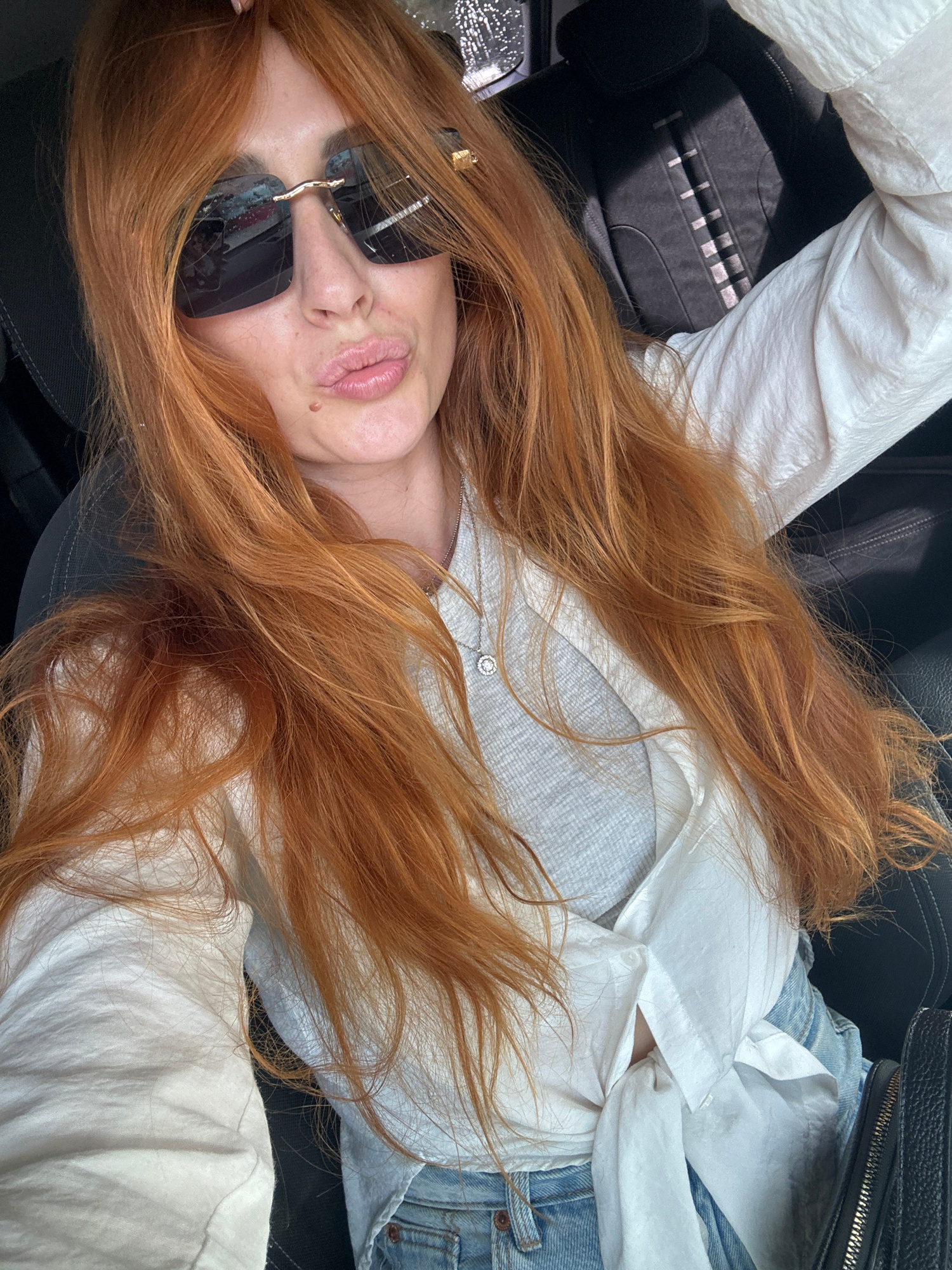 A person with long, flowing, bright reddish-brown hair is captured in a high-angle, medium close-up shot, lying down and looking towards the camera. The individual wears large, dark, rectangular sungl…read more