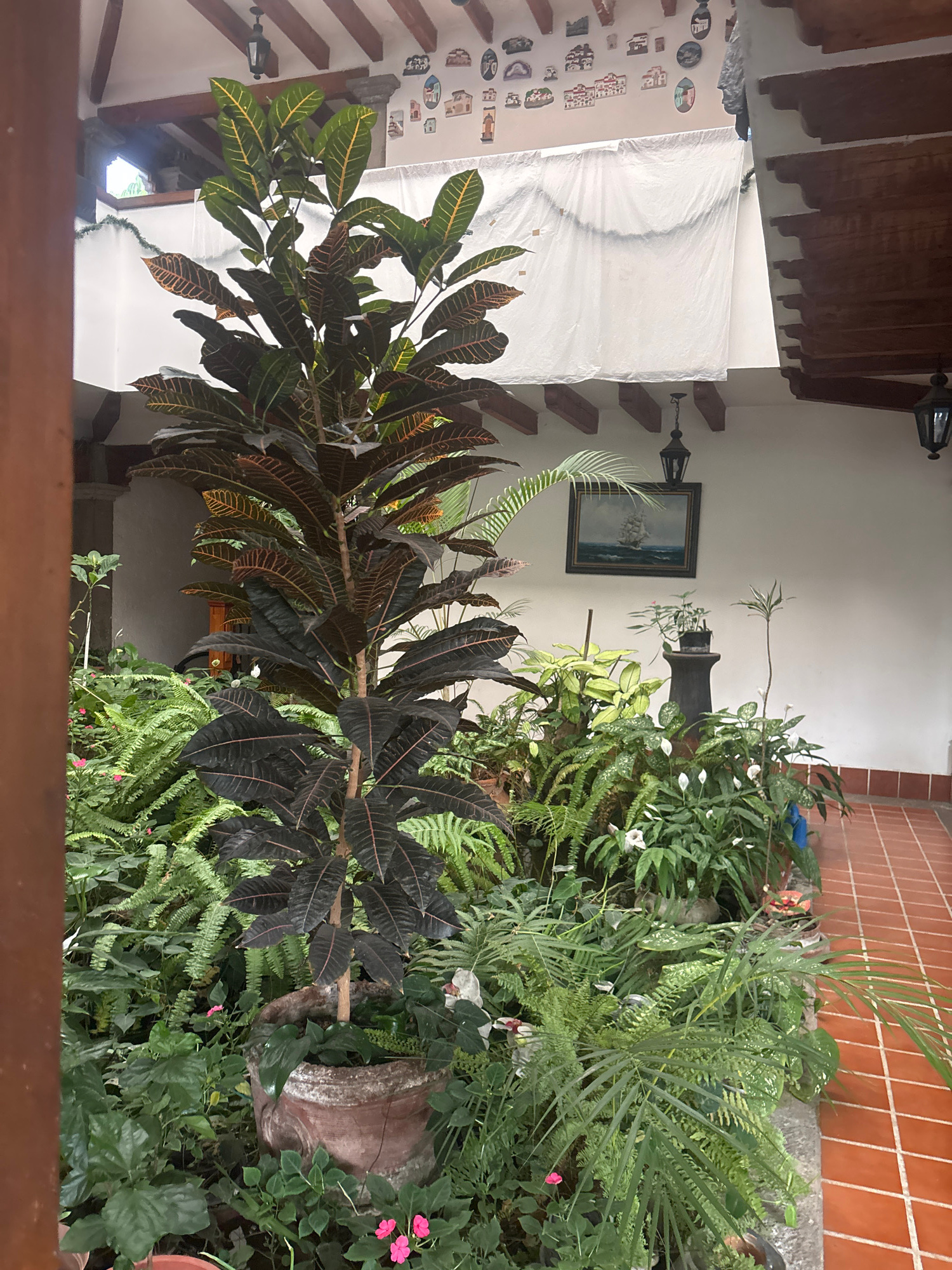 This indoor scene in Cuernavaca, Mexico, features a diverse collection of plants. A large croton plant with variegated leaves dominates the foreground. In the background, a variety of ferns, leafy gre…read more