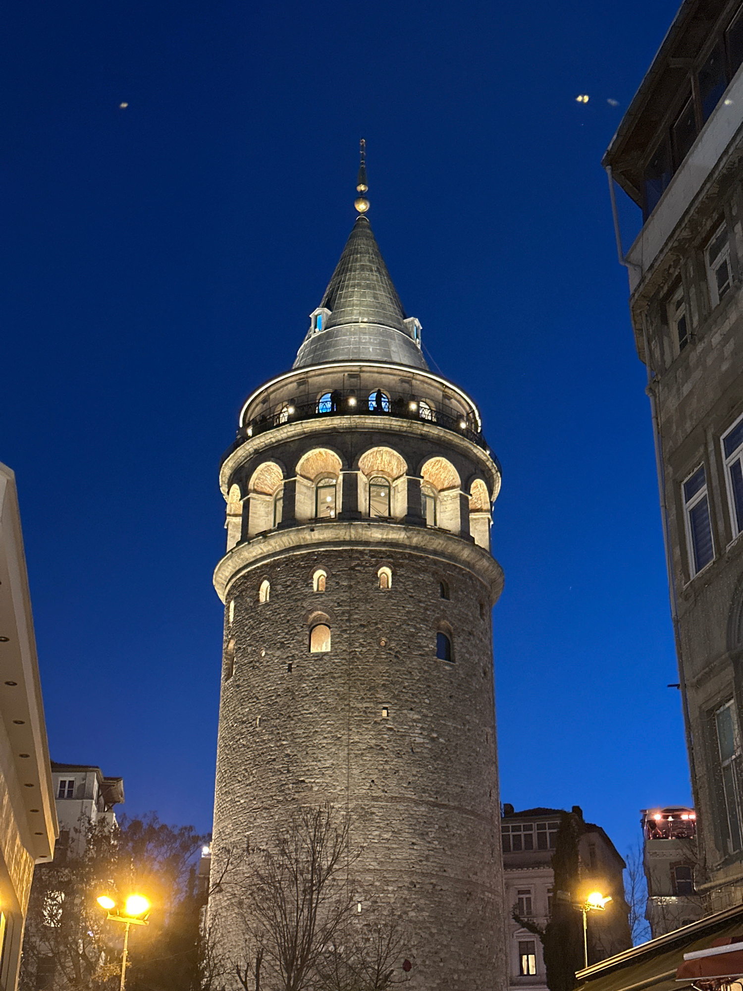 Captured from a low-angle, the image showcases the Galata Tower, a historical landmark in Beyoğlu, Turkey, during the evening. The tower's cylindrical stone structure is prominently featured, illumina…read more