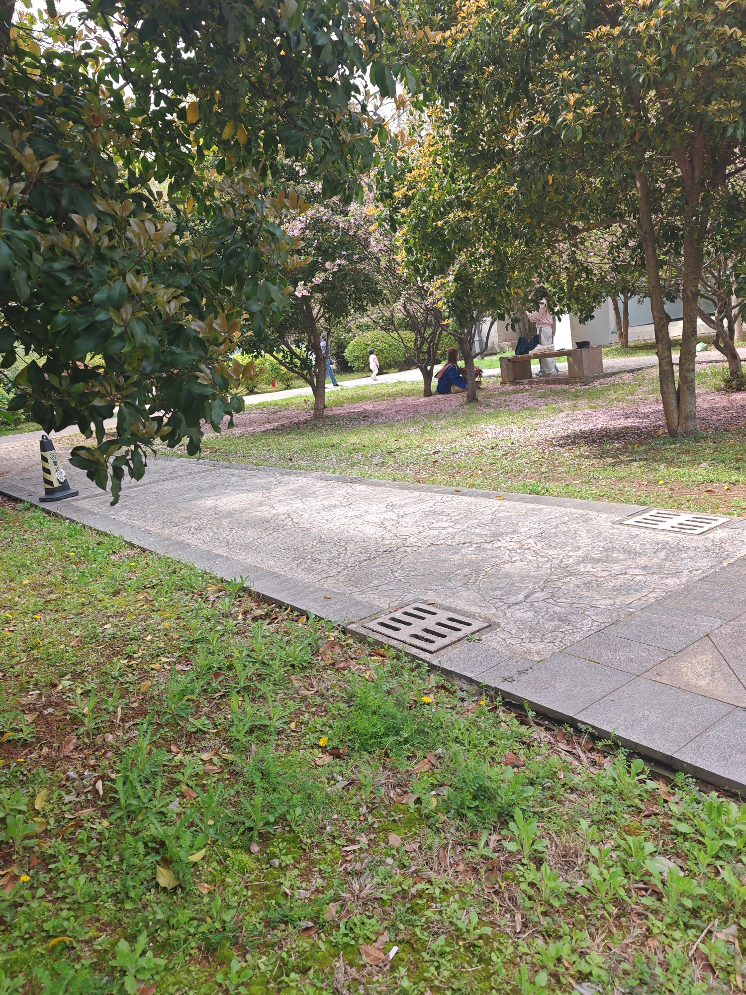 The image depicts a park scene in Jiangning District, China. A paved pathway runs through a grassy area with scattered trees. A yellow and black traffic cone sits at the edge of the path. The path has…read more