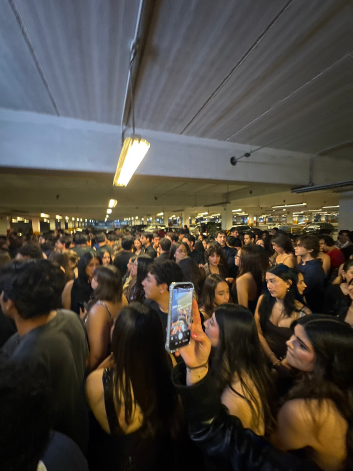A dense crowd of people is packed into a large hall, likely an auditorium or performance venue. Most appear to be young adults, primarily with dark hair. Many are looking downward, possibly at a stage…read more