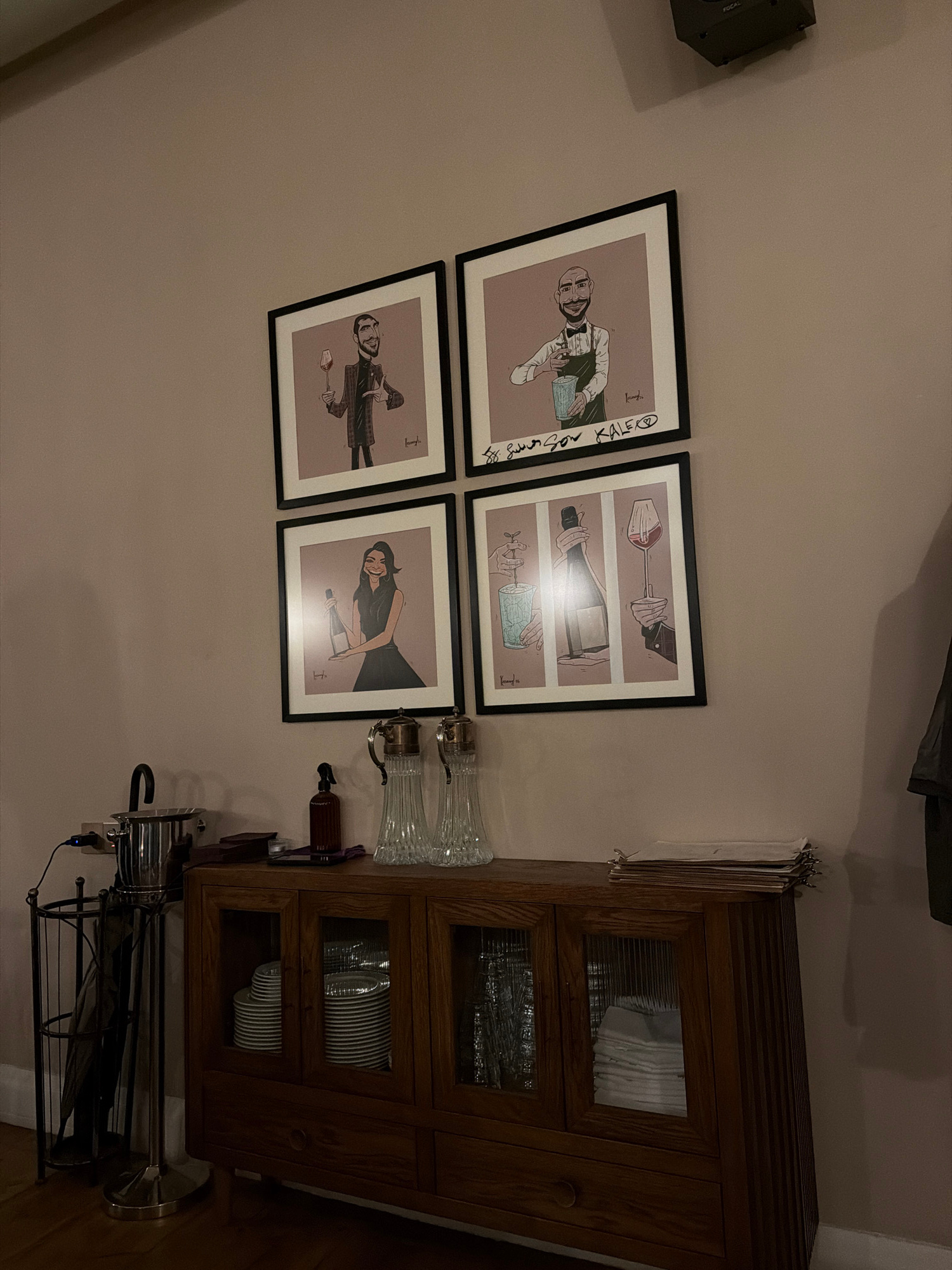 The image depicts an interior wall with four framed art prints arranged in a square formation. To the right of the prints is a wooden cabinet with glass-paneled doors, behind which plates and glasses…read more