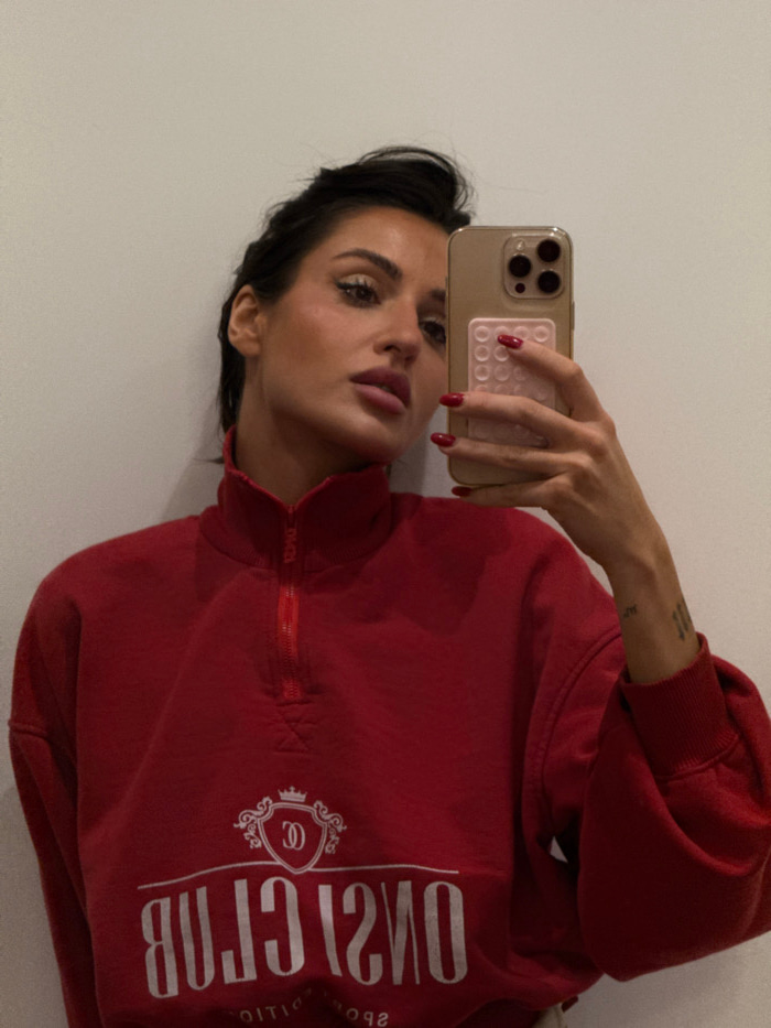 A young woman with dark hair and red nails takes a selfie, holding a tan iPhone with a pink bubble grip on the back. She is wearing a red quarter-zip sweatshirt with a white "Classic Club" logo on the…read more
