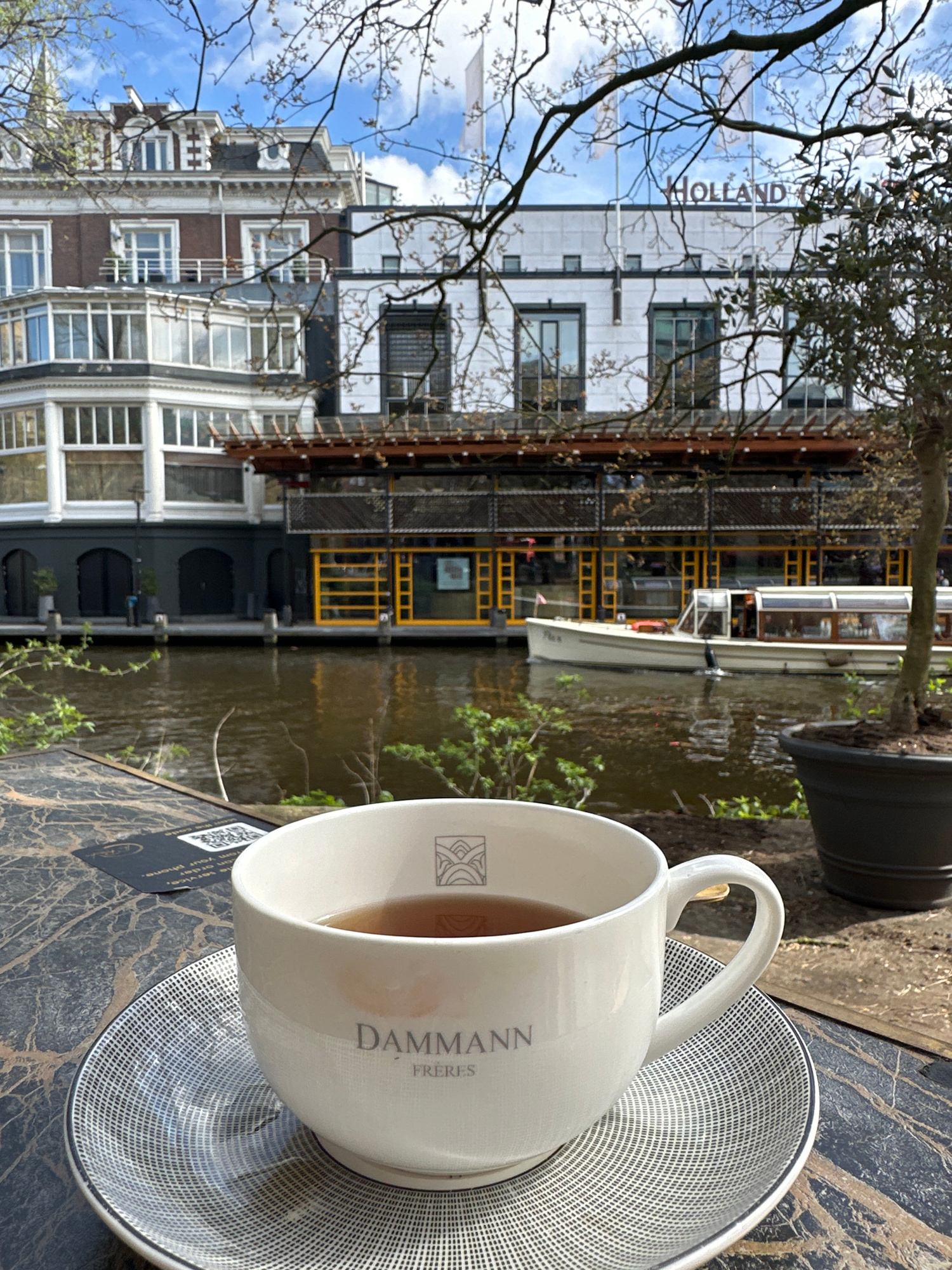 The image shows a cup of tea on a saucer, with a canal in Amsterdam in the background. The cup is white and has the brand "DAMMANN FRERES" printed on it. The saucer is a fine, dense pattern of tiny ci…read more