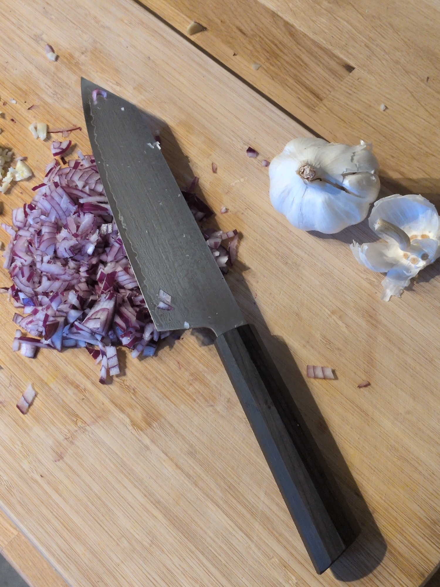 The image depicts a wooden cutting board on which a chef's knife rests atop a pile of diced red onion. Two heads of garlic are also present on the board. The location is not discernible from the image…read more