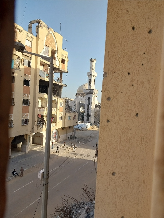 An elevated view captures a street scene in Khan Yunis, Palestinian Territory, characterized by significant structural damage. In the immediate right foreground, a textured, light-tan concrete wall fr…read more
