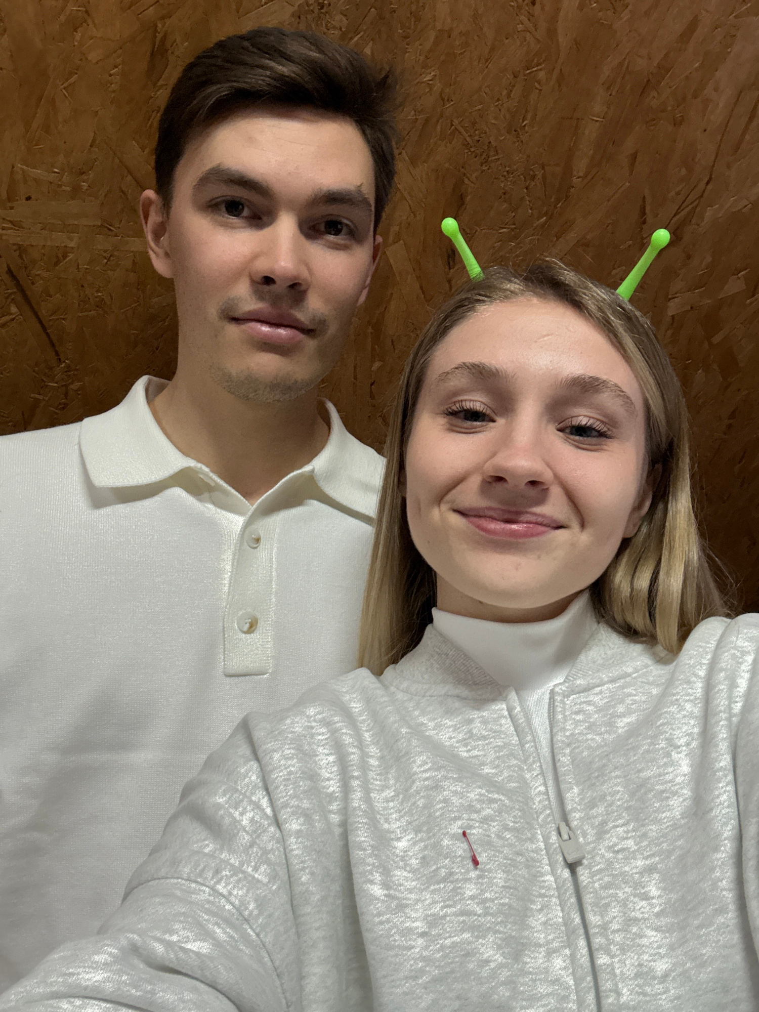 The image shows a selfie of two people indoors, possibly against a plywood wall. The individuals are both wearing white tops; the woman is wearing a light grey hoodie with a red safety pin, and the ma…read more