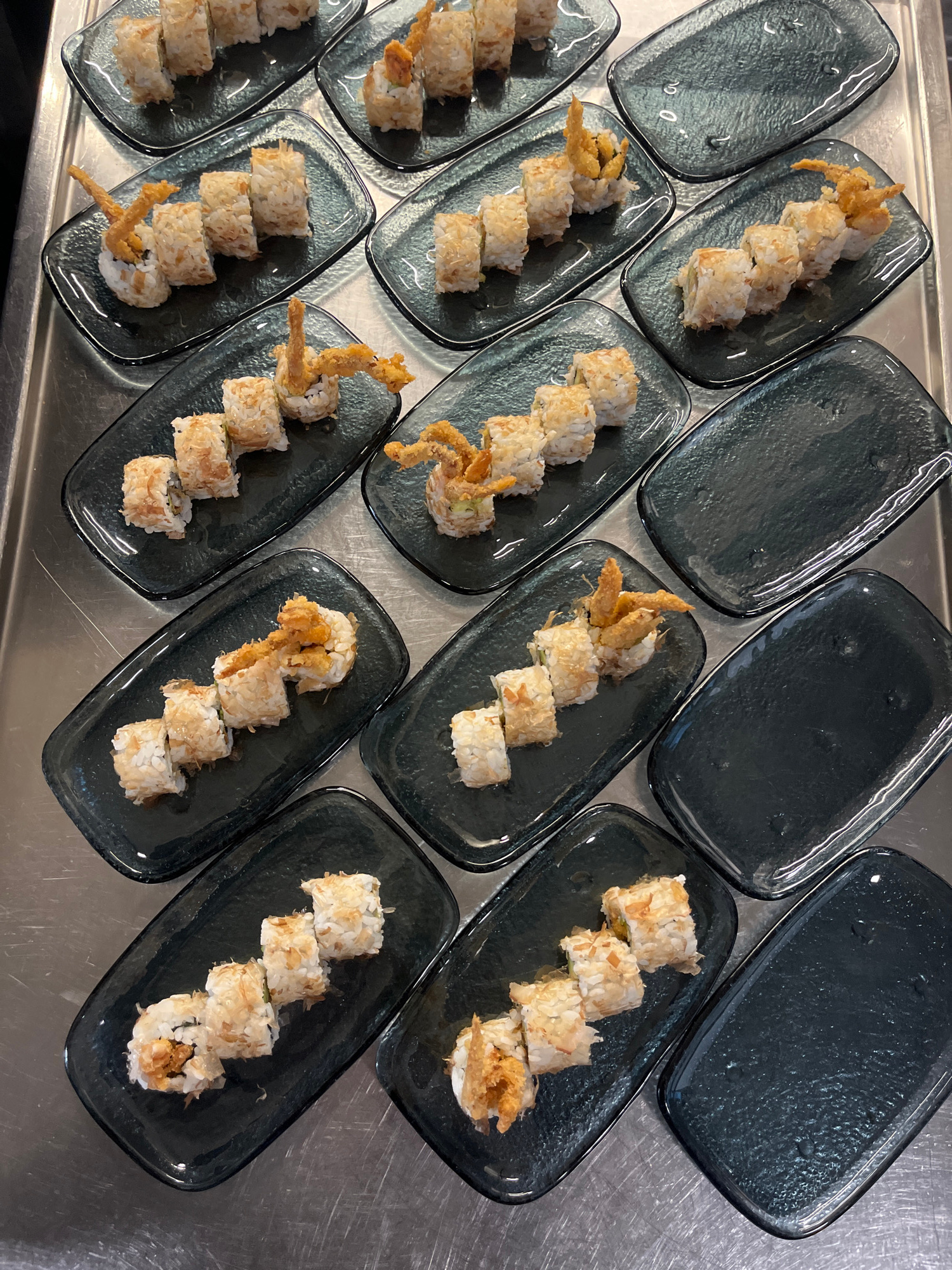 The image shows a top-down view of twelve small, dark gray glass plates arranged on a stainless steel surface. Each plate contains sushi rolls. Some plates have sushi rolls topped with fried crab. Theβ¦read more